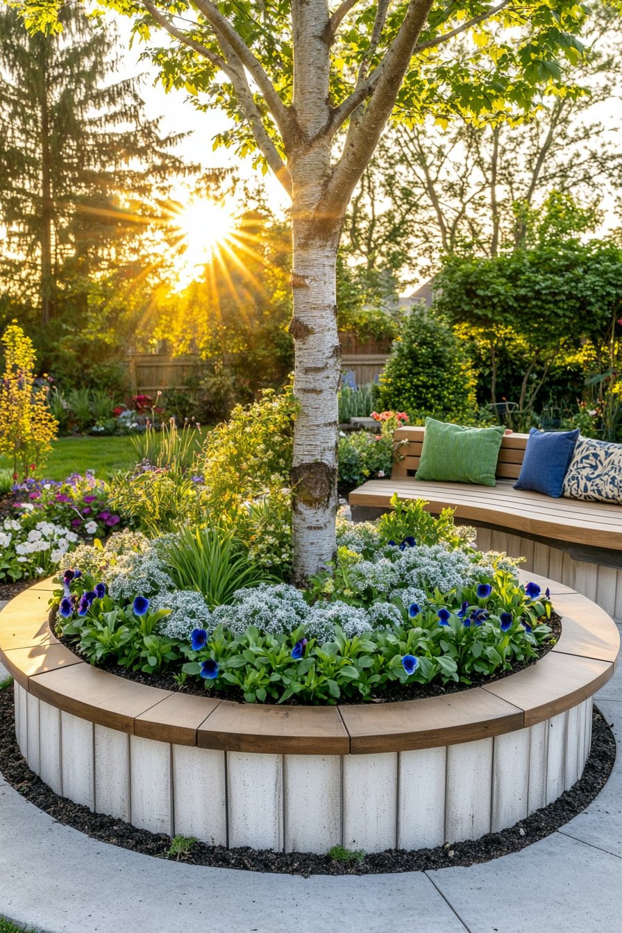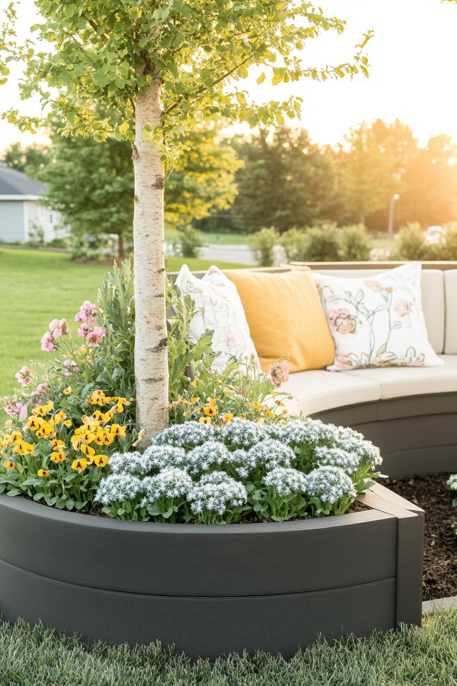 The circular bench creates a cozy gathering space surrounded by vibrant petunias and delicate alyssum, adding both color and texture. To achieve this look, incorporate a mix of annuals and perennials around a central feature, ensuring seasonal interest and easy maintenance.