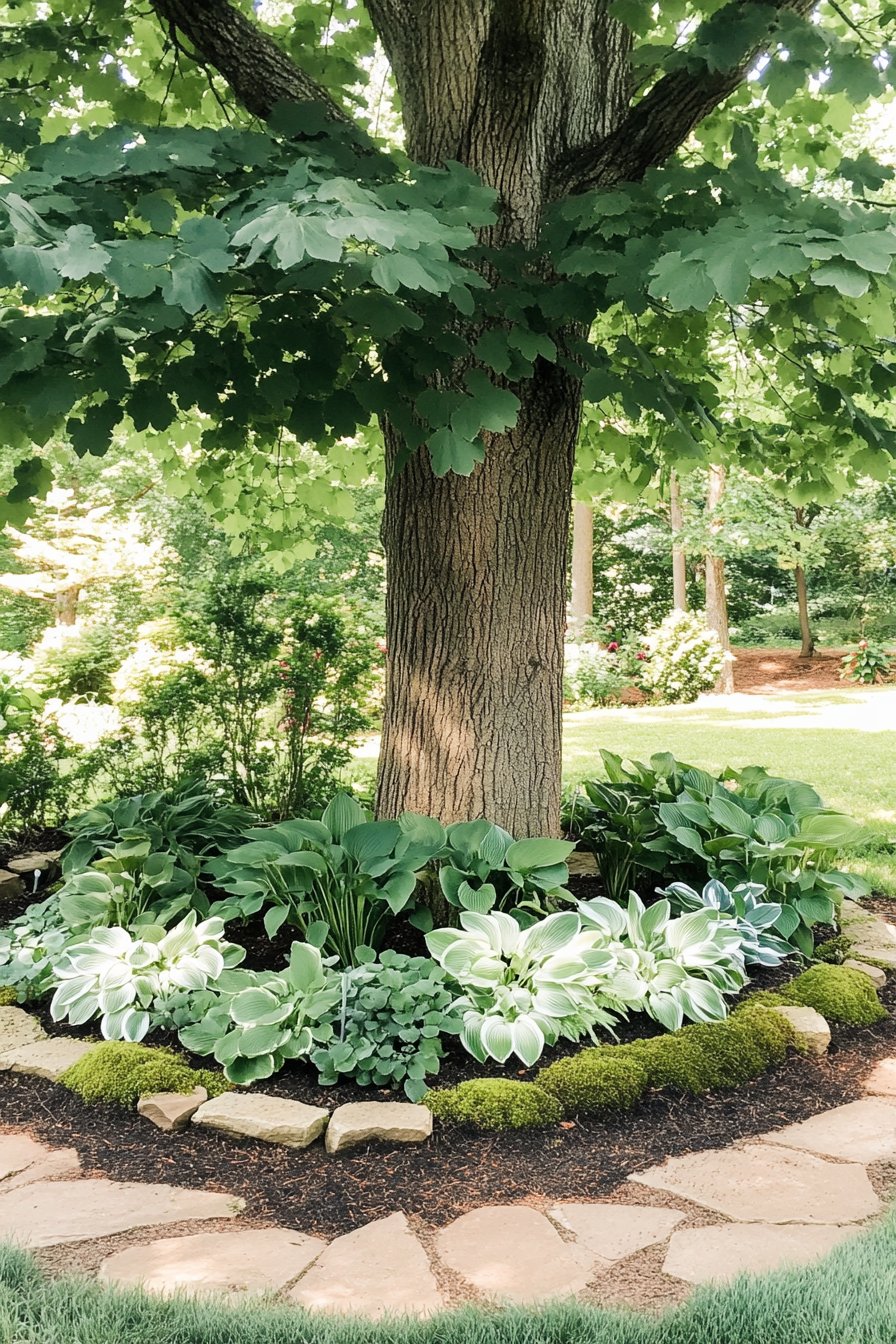 Lush hostas in varying shades of green and white create a serene underplanting around a majestic maple, enhancing the tree’s grandeur. For a similar effect, incorporate diverse hosta varieties and surround them with natural stone pathways and soft moss for texture.