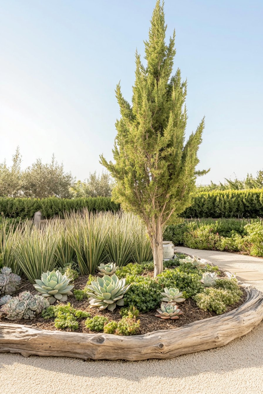 The harmonious blend of lush cypress and vibrant succulents creates a striking contemporary aesthetic, perfect for low-maintenance gardening. To replicate this look, use a mix of Echeveria and Sedum alongside native grasses for textural variety and visual interest.