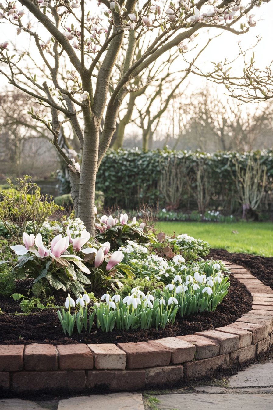 The graceful curves of this garden design beautifully showcase the delicate pink magnolia blooms alongside clusters of pure white snowdrops, creating a serene atmosphere. To replicate this enchanting look, consider planting magnolias for height and layering snowdrops at the base for a stunning contrast in color and texture.