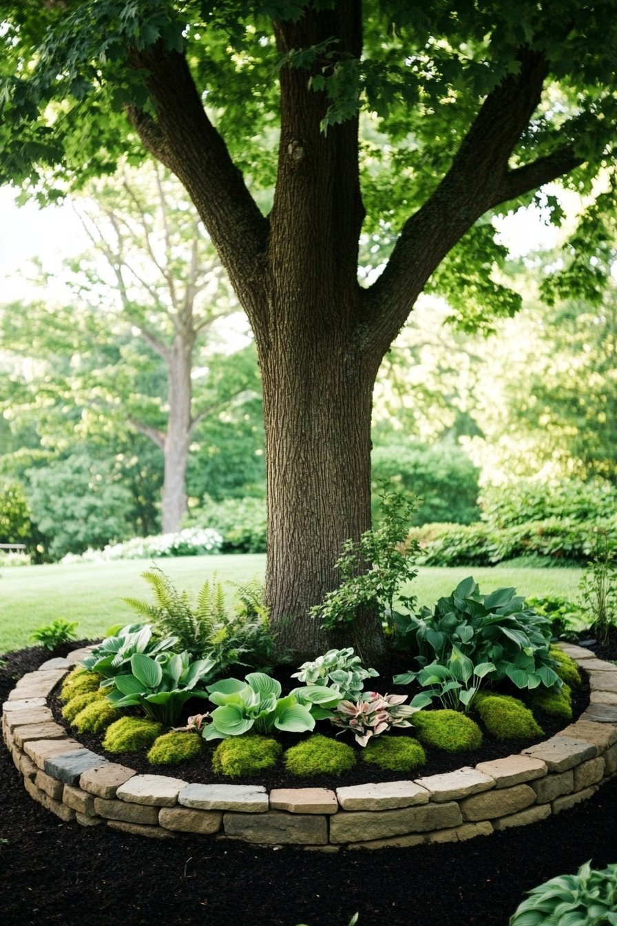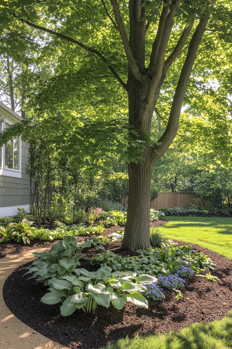 Lush hostas and vibrant perennials create a stunning undercanopy around a mature tree, offering both shade and texture. To replicate this look, choose a mix of foliage plants and colorful flowers, ensuring proper spacing and mulch for moisture retention.
