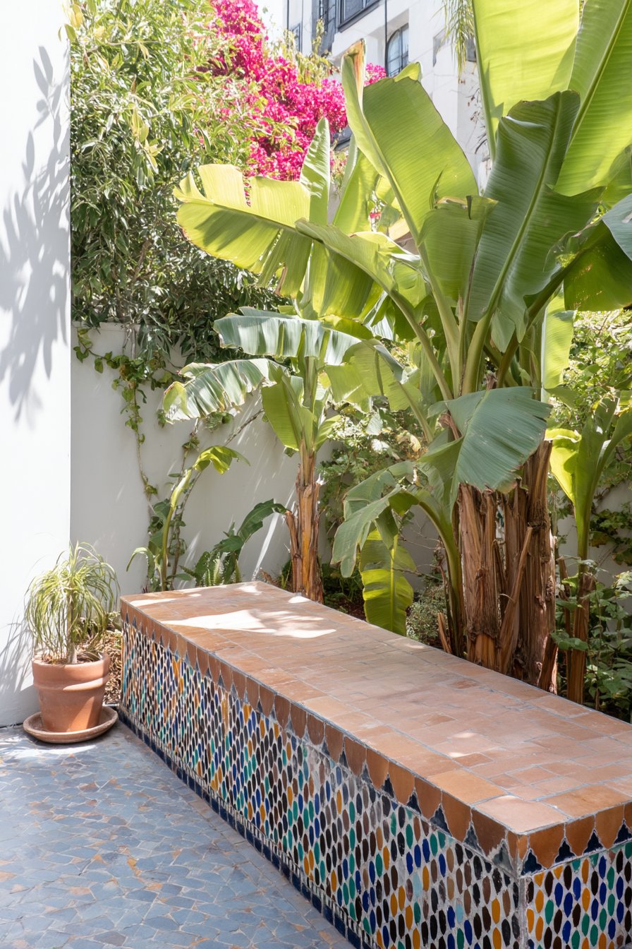 Lush tropical plants like banana trees and vibrant bougainvillea create a captivating retreat, while colorful mosaic tiles add artistic flair. To replicate this look, incorporate a mix of tall greenery and bold flowers, and consider a decorative bench for seating.