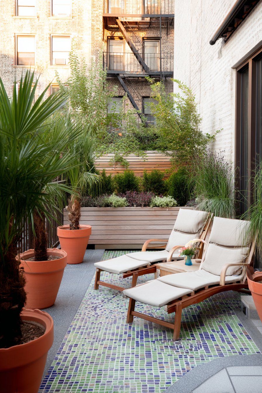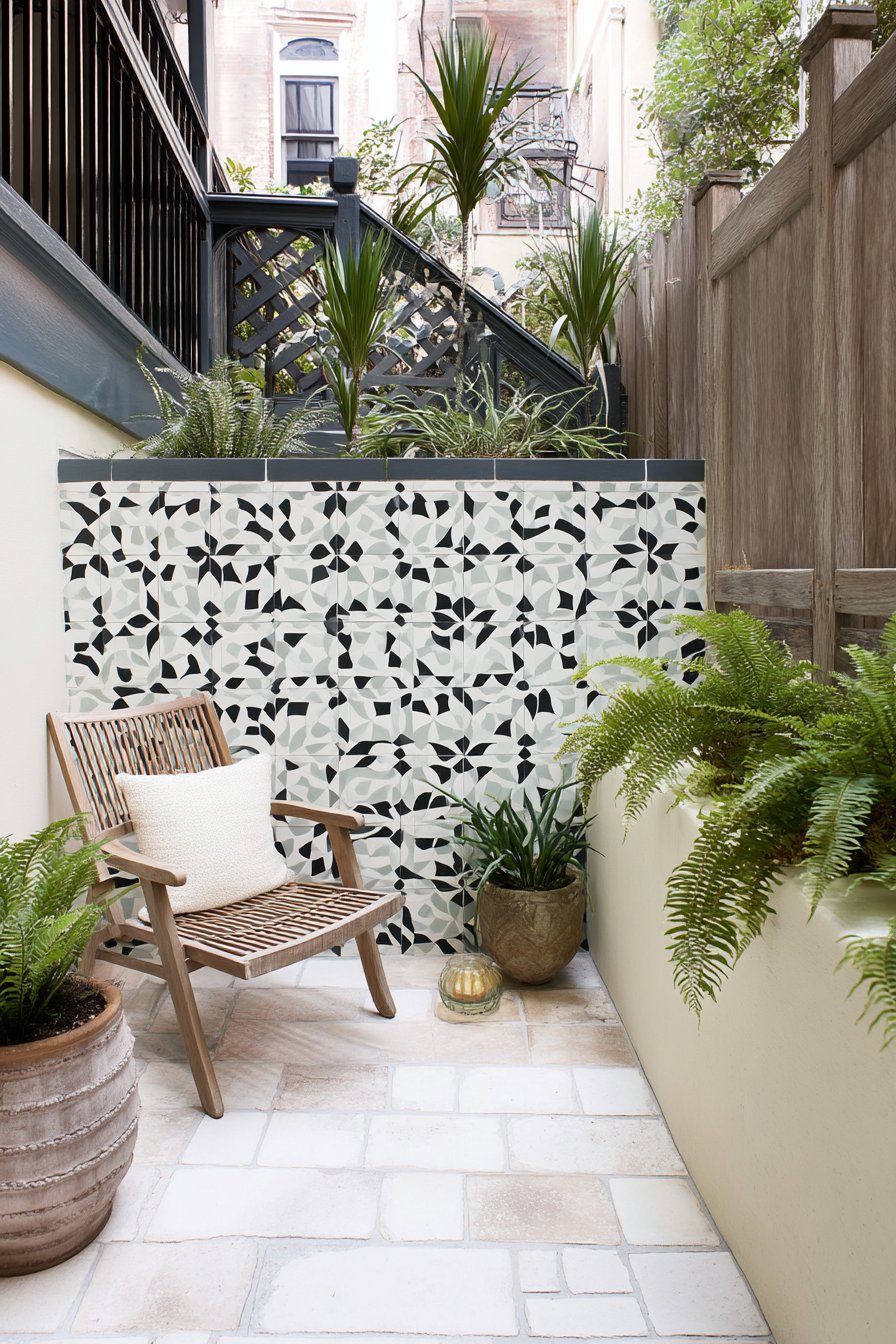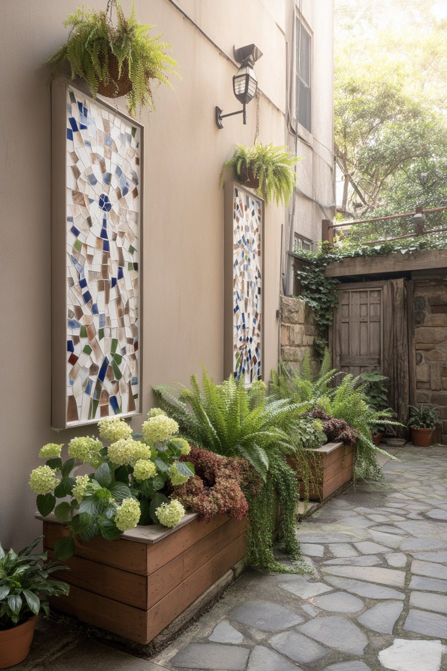 This design features a stunning mosaic tile backdrop that beautifully contrasts with lush ferns and modern planters, creating a serene retreat. To replicate this look, choose a mix of hardy ferns and stylish tiles, and incorporate comfortable seating for relaxation.