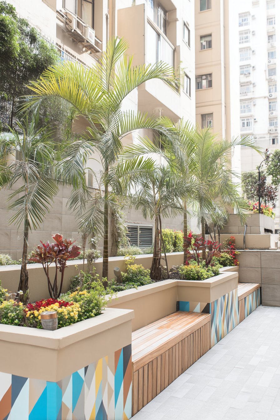 This vibrant urban garden features lush palms and strikingly colored foliage, creating a lively and inviting atmosphere. Incorporate a mix of tropical plants, like crotons and marigolds, to achieve a similar dynamic look in your own space.