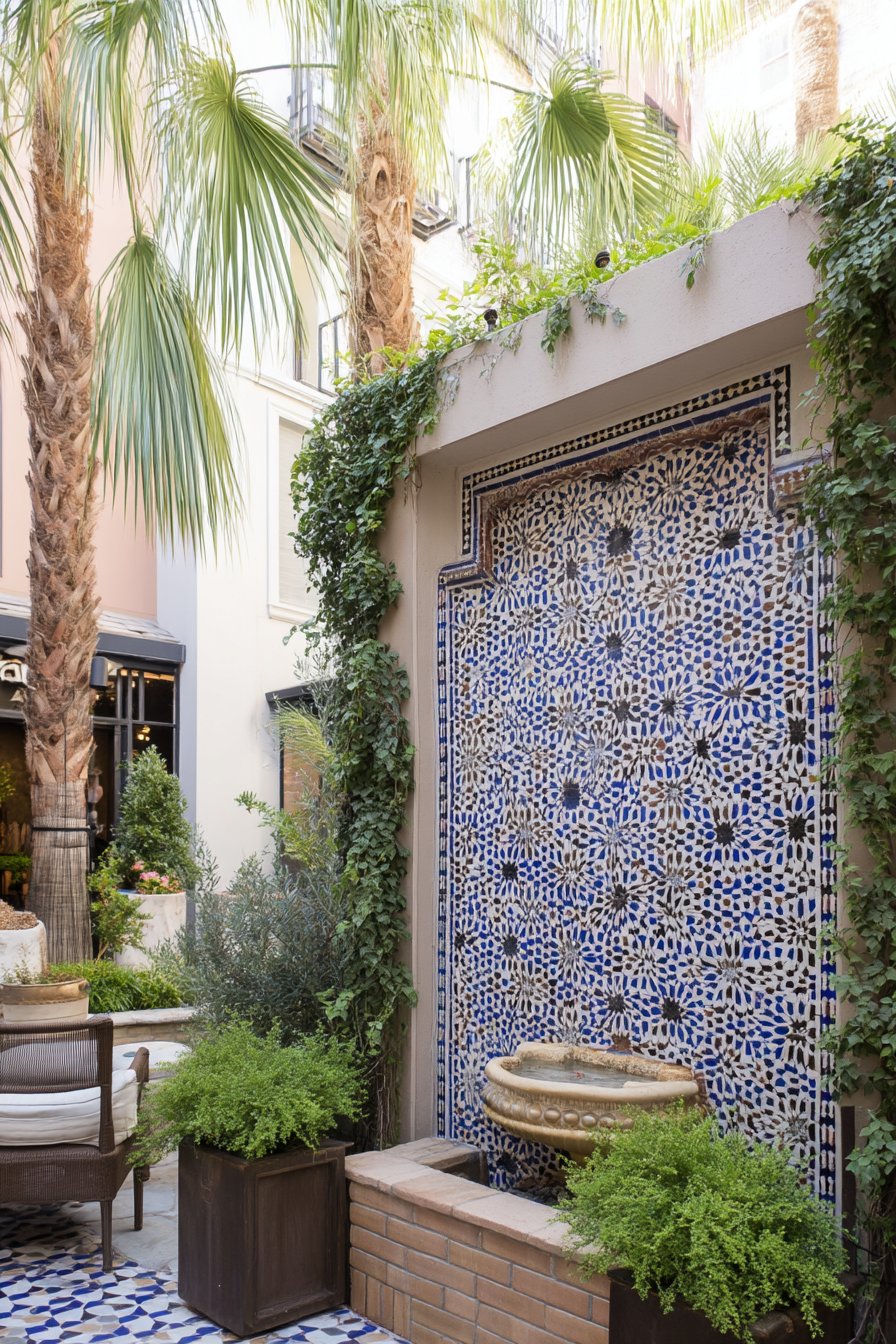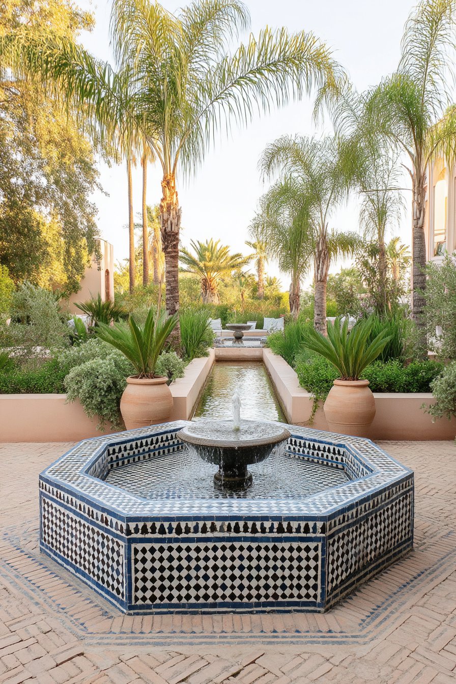 The striking mosaic fountain surrounded by lush palm trees and elegant greenery creates a serene oasis, perfect for relaxation. To replicate this look, use terracotta pots for plants like agave and ornamental grasses, and incorporate a central water feature for tranquility.