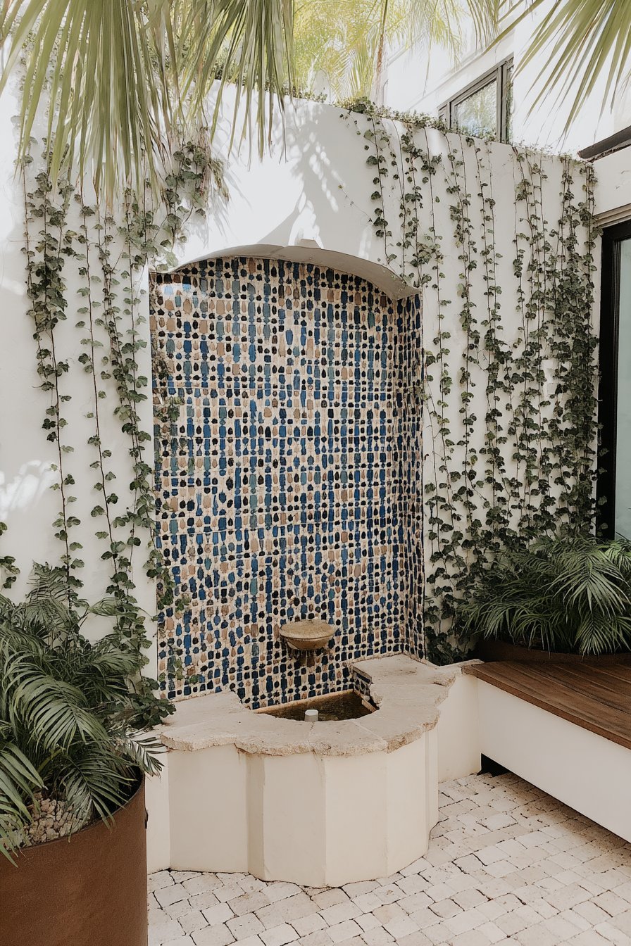 The vibrant mosaic water feature creates a stunning focal point, enhanced by lush trailing vines like ivy for a naturalistic touch. To replicate this look, incorporate a mix of colorful tiles and select low-maintenance plants like ferns and palms for a serene retreat.