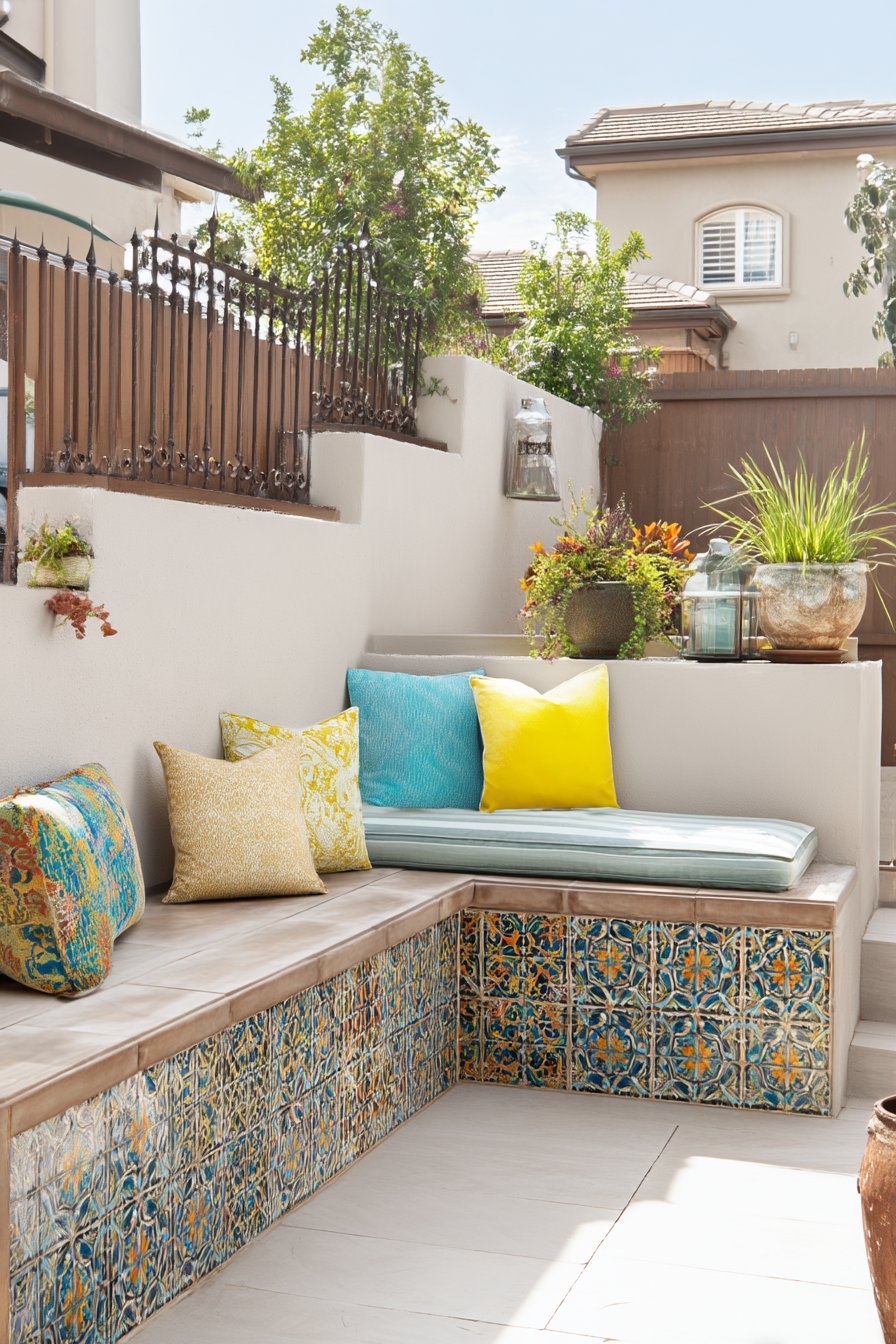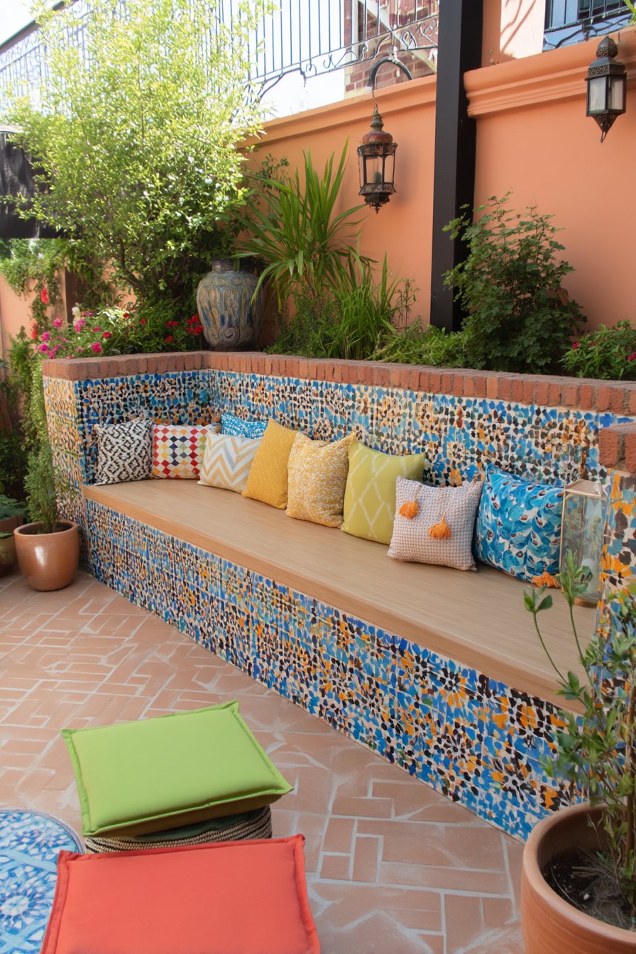 The vibrant mosaic seating, adorned with colorful pillows, creates an inviting focal point perfect for relaxation. Incorporate drought-resistant plants like succulents and vibrant annuals to achieve a similar lively atmosphere.
