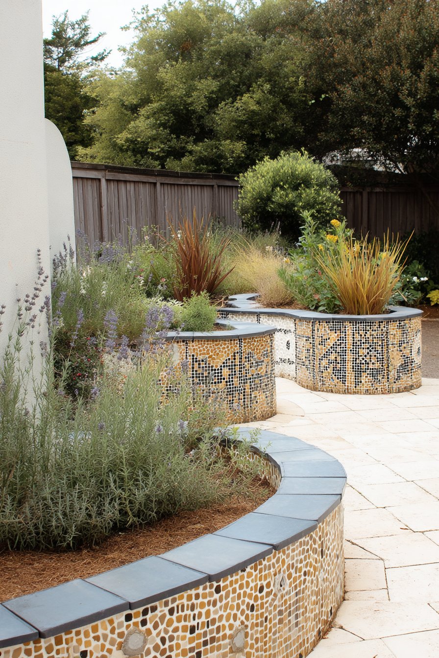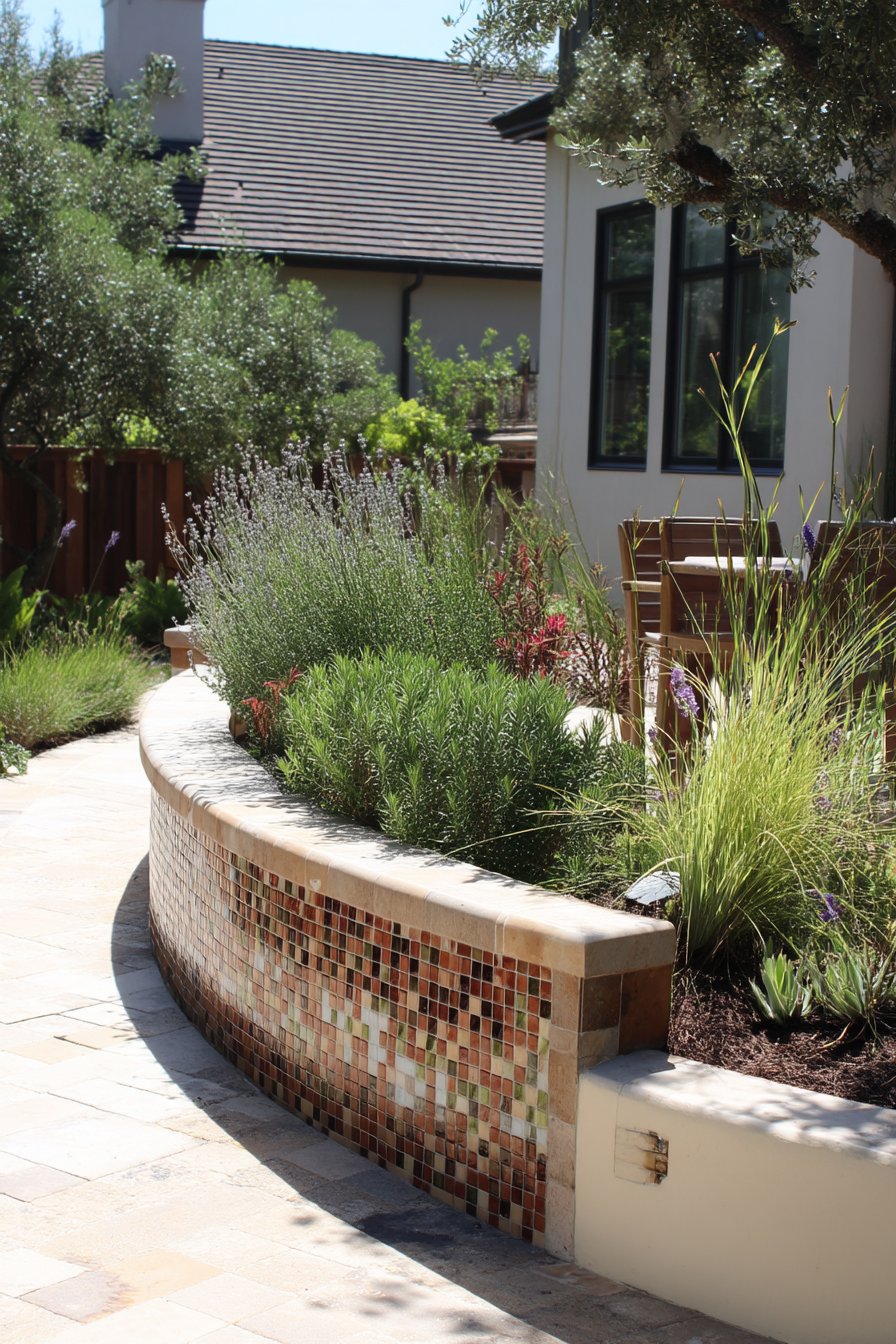 This garden features vibrant mosaics that beautifully contrast with soft lavender accents, creating a harmonious blend of color and texture. To replicate this look, plant fragrant lavenders alongside ornamental grasses for dynamic movement and visual interest.