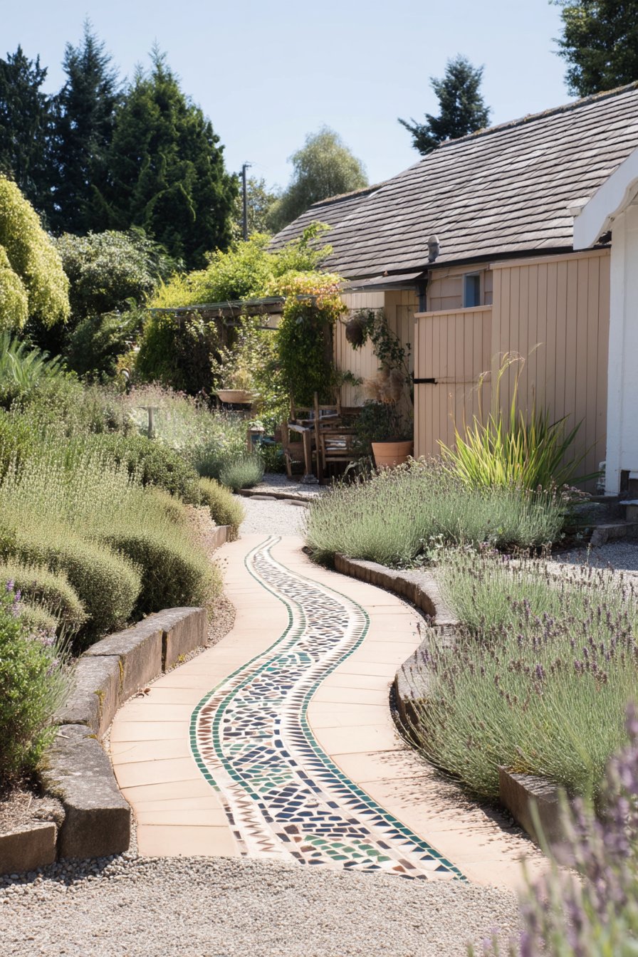 A winding pathway adorned with colorful mosaic tiles creates a captivating focal point, bordered by fragrant lavender that adds both beauty and a soothing aroma. To replicate this serene look, use durable materials for the path and plant lavender in well-draining soil to thrive in sunny spots.