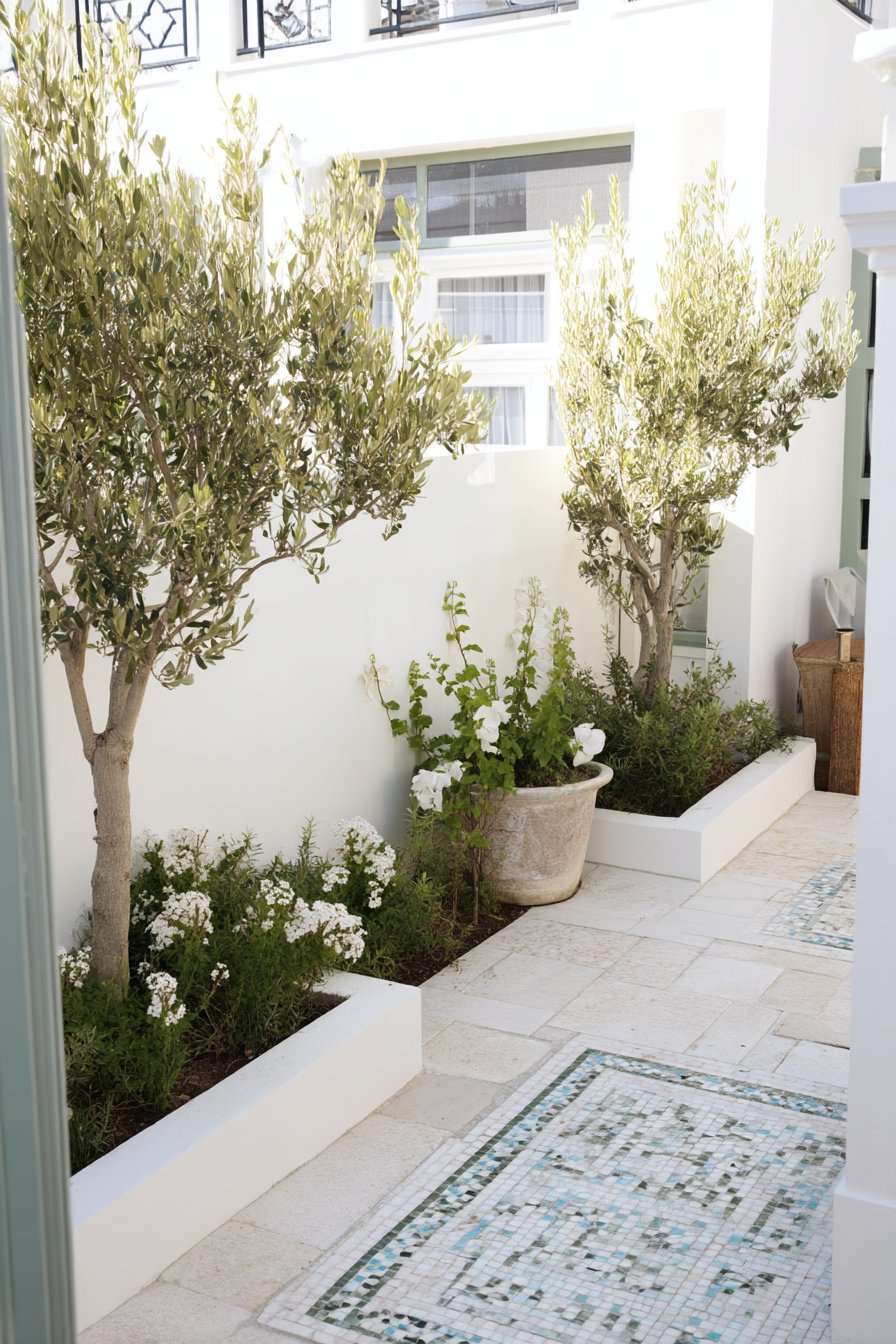 The design features elegant olive trees paired with lush white flowering plants, creating a serene and sophisticated atmosphere. To replicate this look, consider using raised beds and incorporating mosaic pathways for visual interest.
