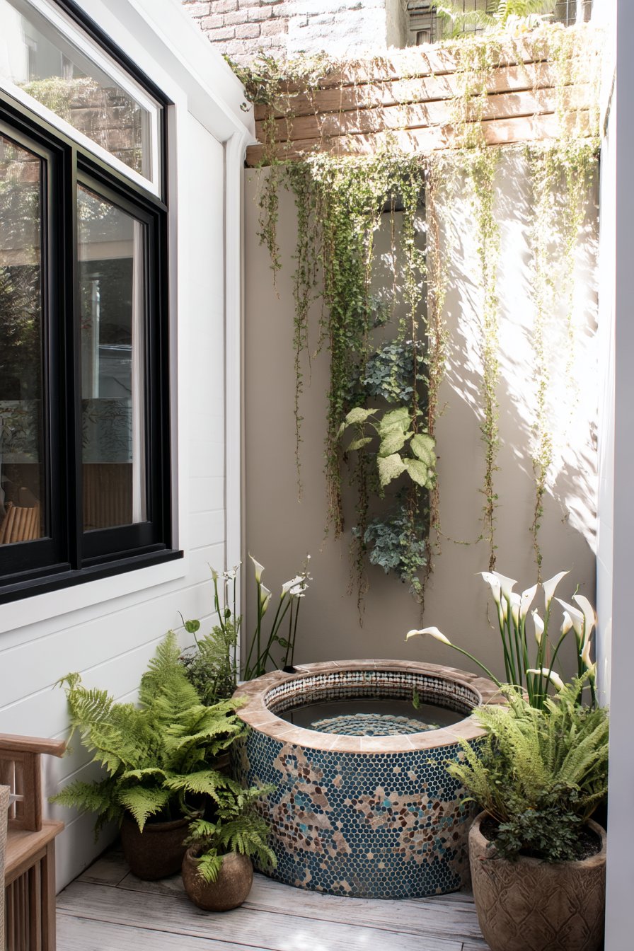 This serene retreat features a mosaic water feature surrounded by lush ferns and elegant calla lilies, creating a tranquil atmosphere. To replicate this look, combine various textures and colors in planters, and incorporate a small water element for soothing sounds.