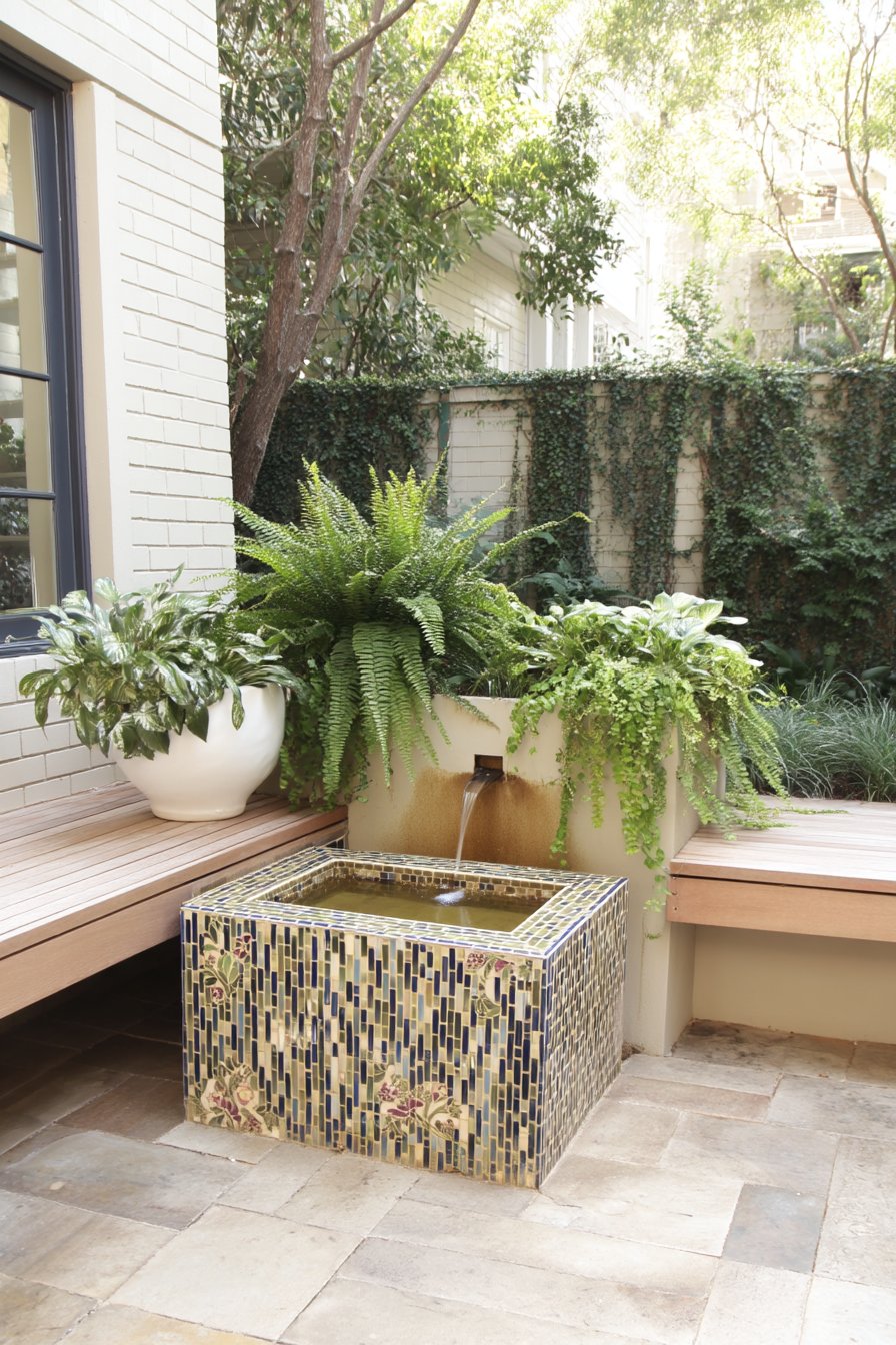 The vibrant mosaic fountain, surrounded by lush ferns and trailing plants, creates a serene focal point that invites tranquility. For a similar effect, incorporate colorful tiles and mix various textures with hardy greenery like ferns and pothos.