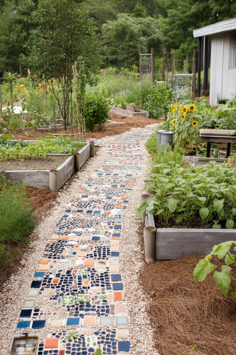 The vibrant mosaic pathway, composed of colorful tiles, beautifully leads through lush vegetable beds, showcasing and aromatic herbs for added charm. To recreate this look, consider mixing reclaimed materials for your path and incorporating that thrive in your climate.