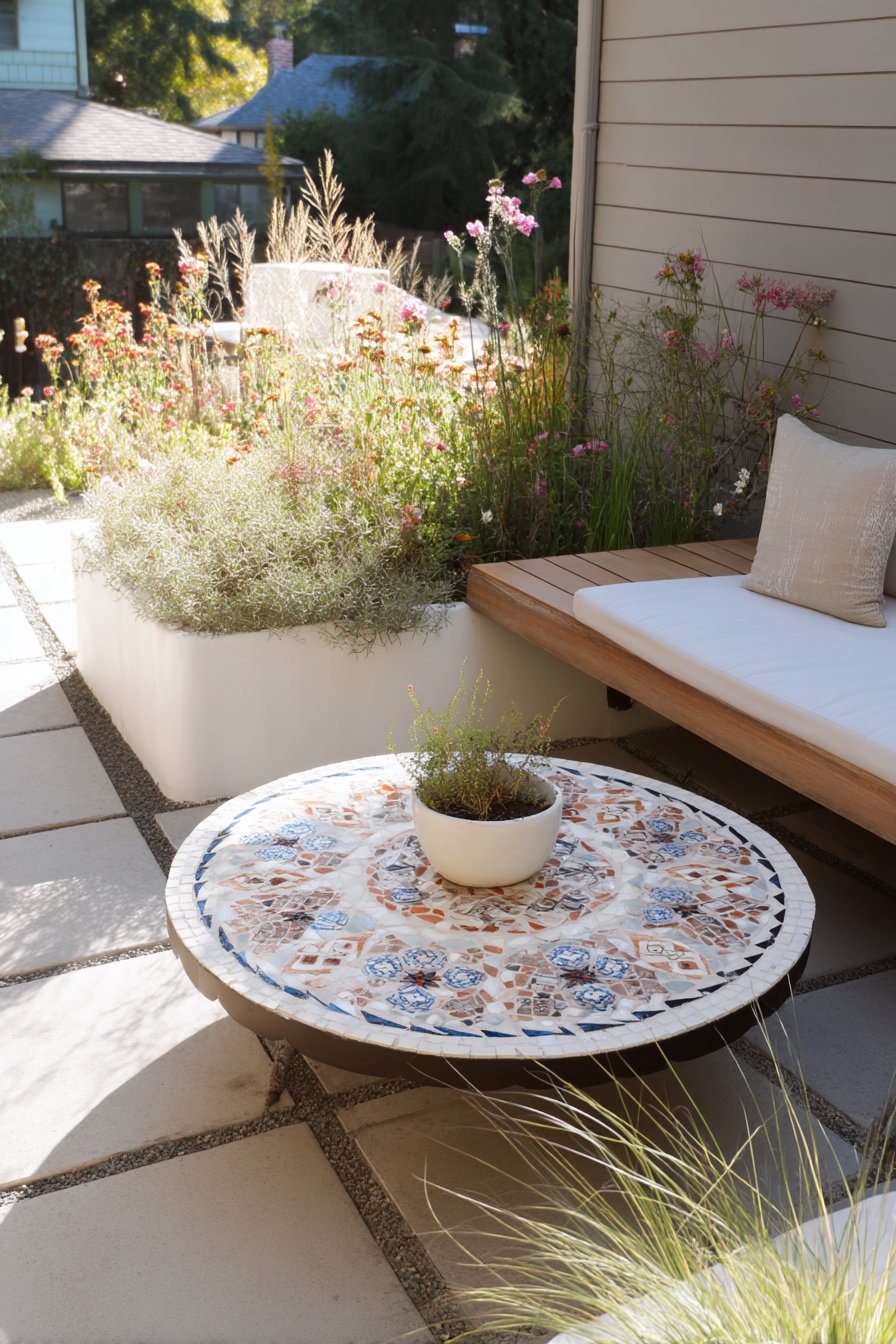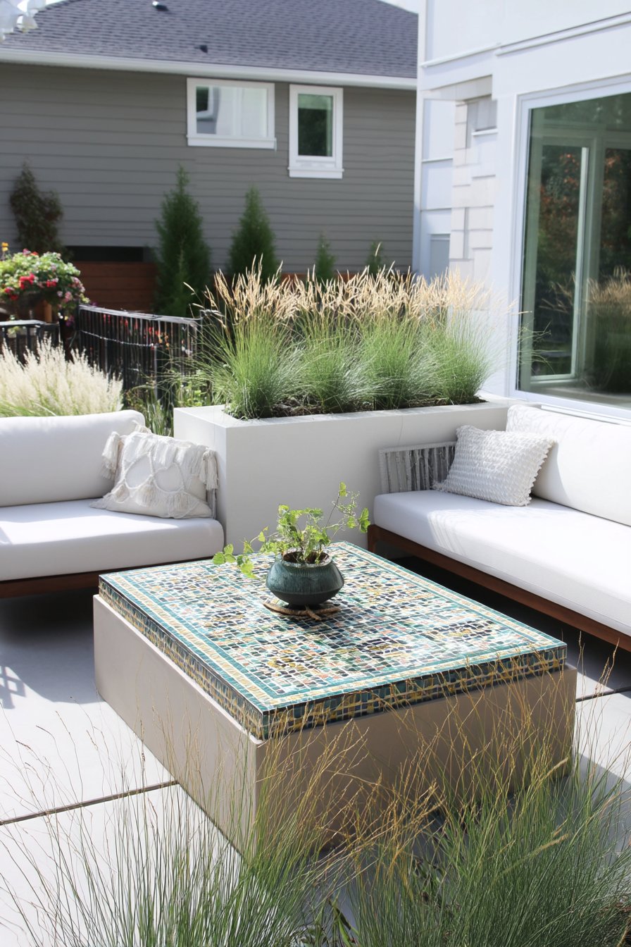 The contemporary mosaic patio features vibrant tiles that create a striking focal point amidst soft grasses, enhancing the outdoor living experience. Incorporate low-maintenance plants like ornamental grasses and succulents to achieve a similar serene and stylish ambiance.