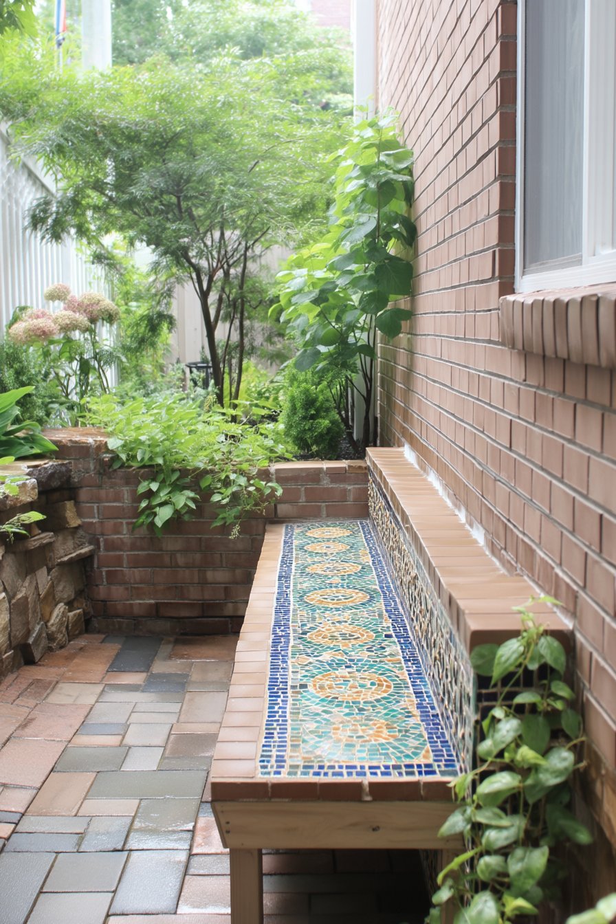 The vibrant mosaic seating harmonizes beautifully with lush tropical foliage, creating an inviting oasis perfect for relaxation. Incorporate large-leaved plants like banana trees and colorful bougainvillea to achieve this tropical aesthetic in your own garden.