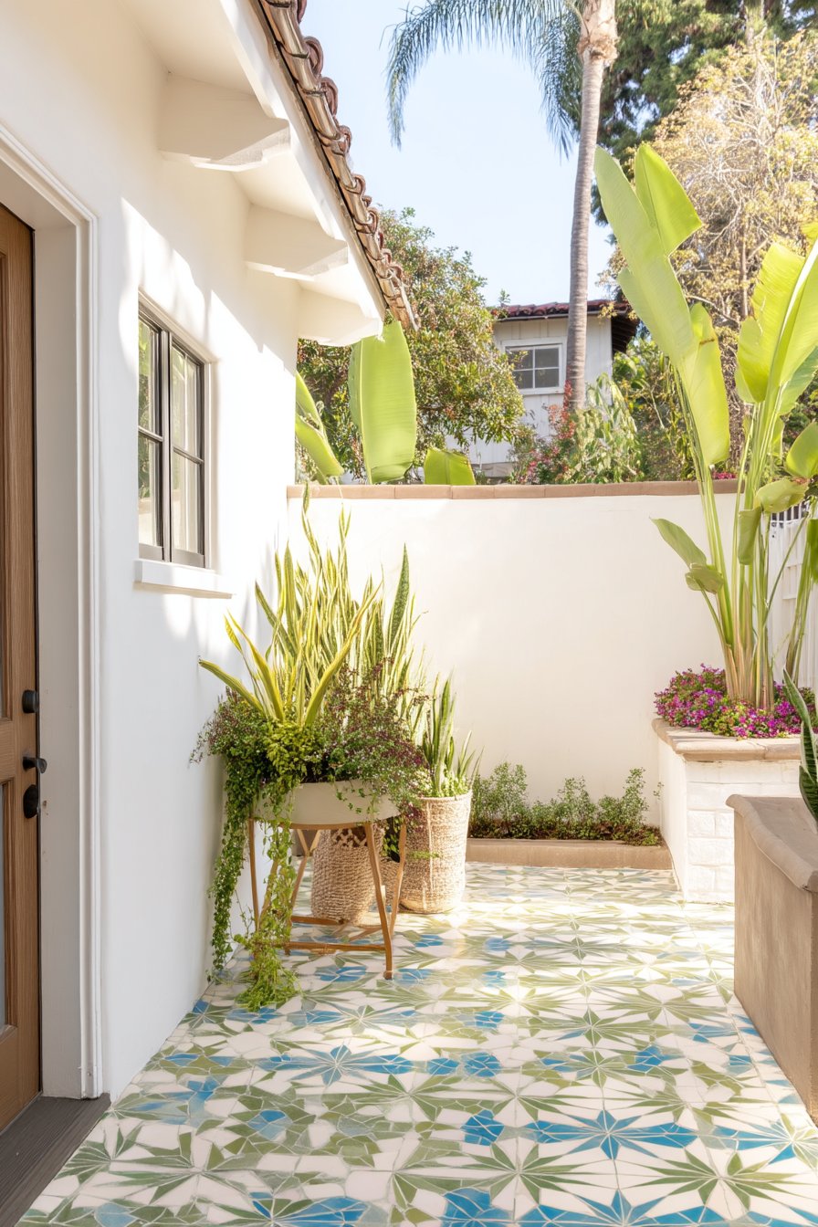 The vibrant mosaic patio bursts with color, featuring lush tropical plants like snake plants and vibrant bougainvillea that create a lively atmosphere. To achieve this look, incorporate patterned tiles and a mix of heights in planters for visual interest.