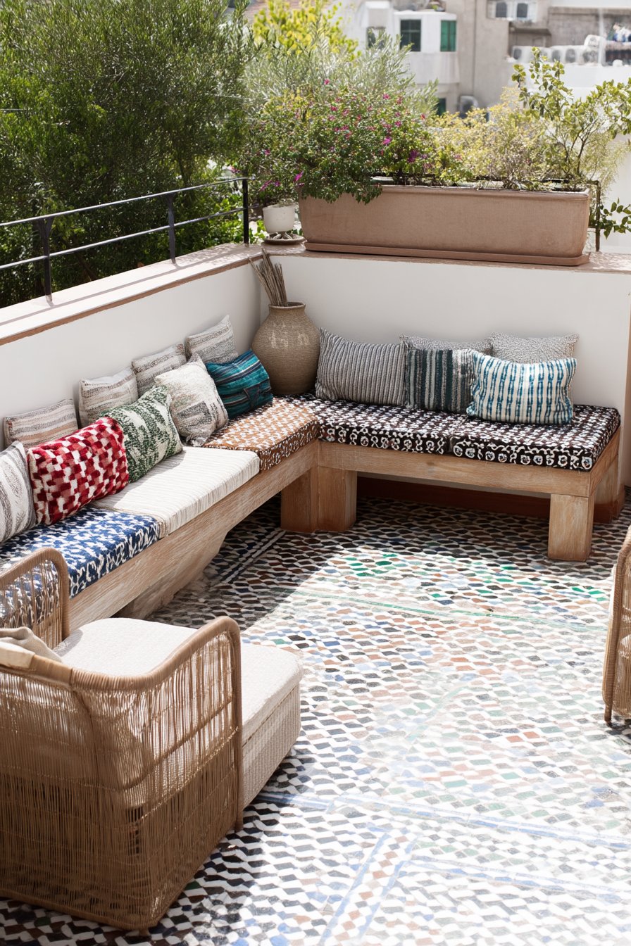 The vibrant mix of patterned cushions and textured seating creates a cozy, inviting atmosphere perfect for relaxation. Incorporate colorful flowering plants like Bougainvillea in containers to enhance the lively aesthetic while ensuring easy maintenance.
