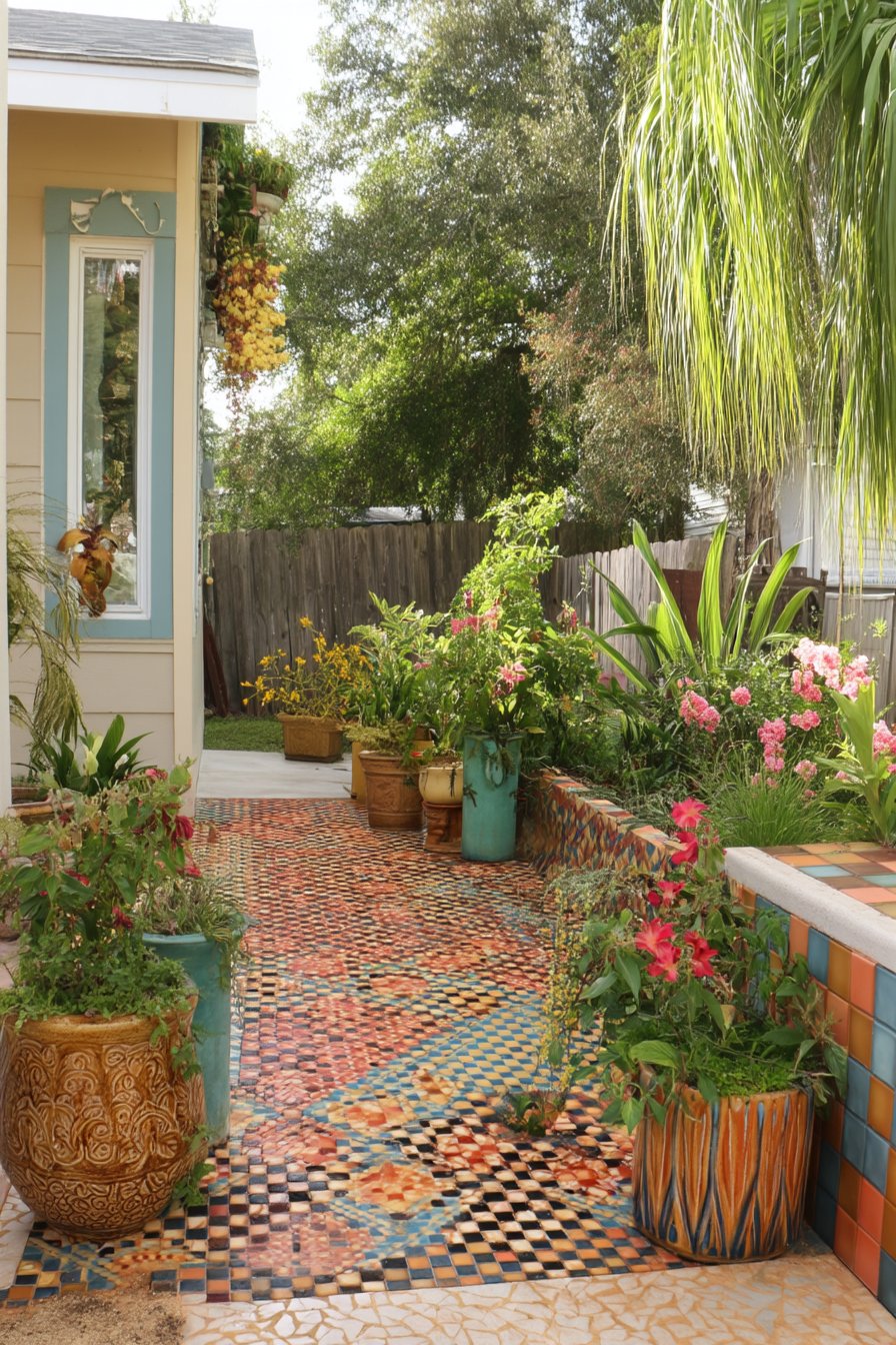 14) Vibrant Mosaic Pathway with Colorful Pots