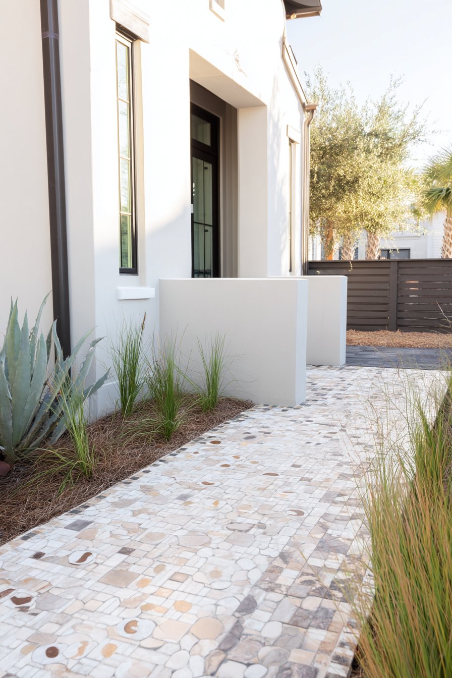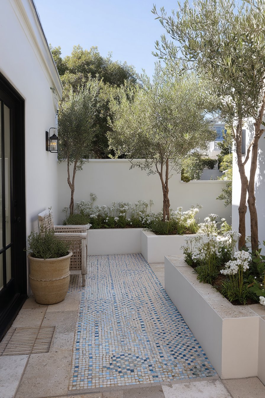 The serene mosaic pathway, complemented by graceful olive trees, creates a peaceful retreat that invites relaxation. Incorporate low-maintenance plants like white alyssum and use natural stone for pathways to achieve a similar aesthetic.