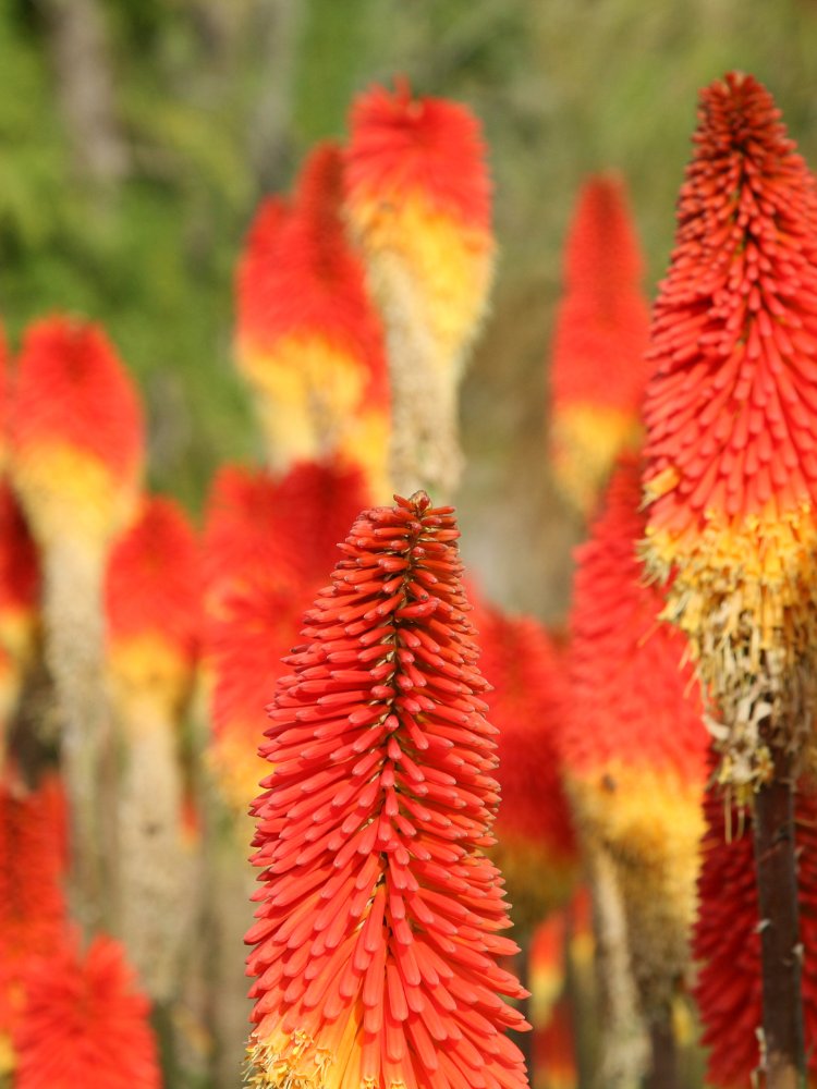 • Kniphofia ‘Flamenco’: This variety features shorter, more compact spikes and a mix of red and orange flowers.