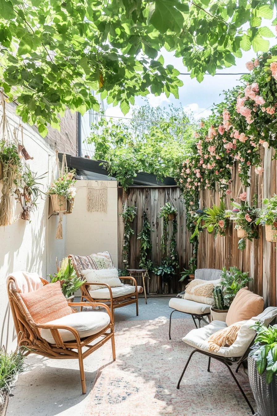 This inviting courtyard features lush greenery and cascading blooms, such as soft pink roses and vibrant foliage, creating a serene atmosphere. Incorporate comfortable seating with textured cushions and hanging planters to achieve a cozy, bohemian vibe in your own outdoor space.