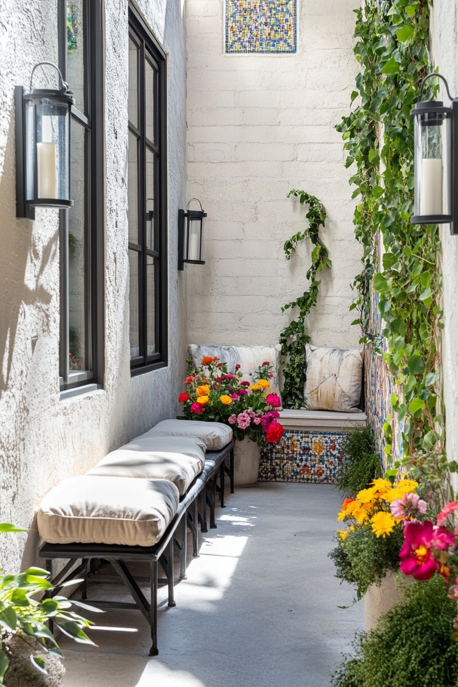 This charming courtyard features a vibrant mix of daisies, marigolds, and delicate lavender, creating a colorful tapestry that invites relaxation. To replicate this cozy atmosphere, incorporate a comfortable seating area surrounded by a variety of flowering plants and decorative accessories like textured throws and cheerful tableware.