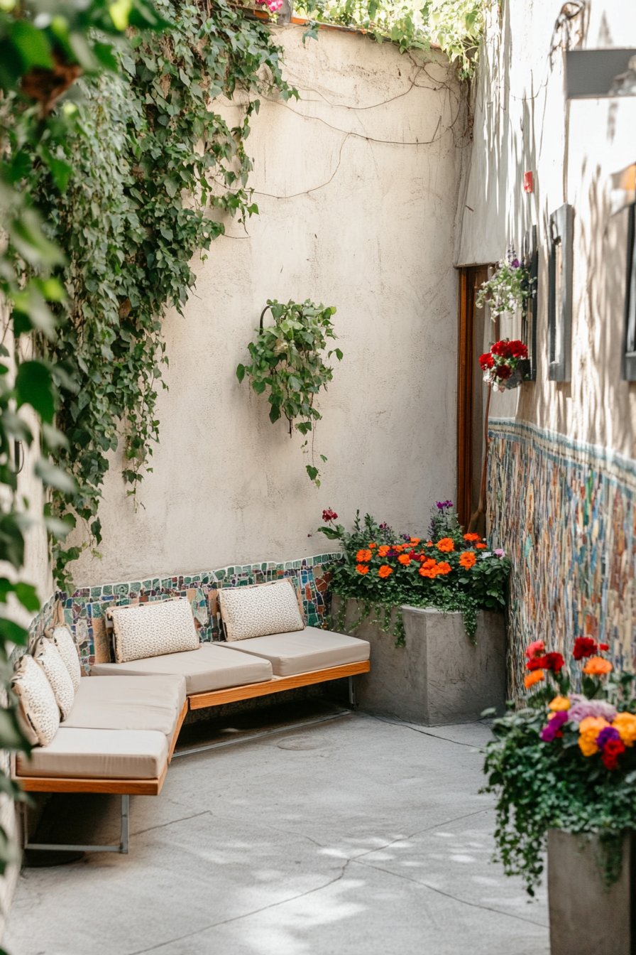 This vibrant urban courtyard features cascading greenery alongside colorful blooms like marigolds and geraniums, creating a lively and inviting atmosphere. To replicate this look, use a mix of container plants with varied heights and colors, and incorporate comfortable seating for relaxation.