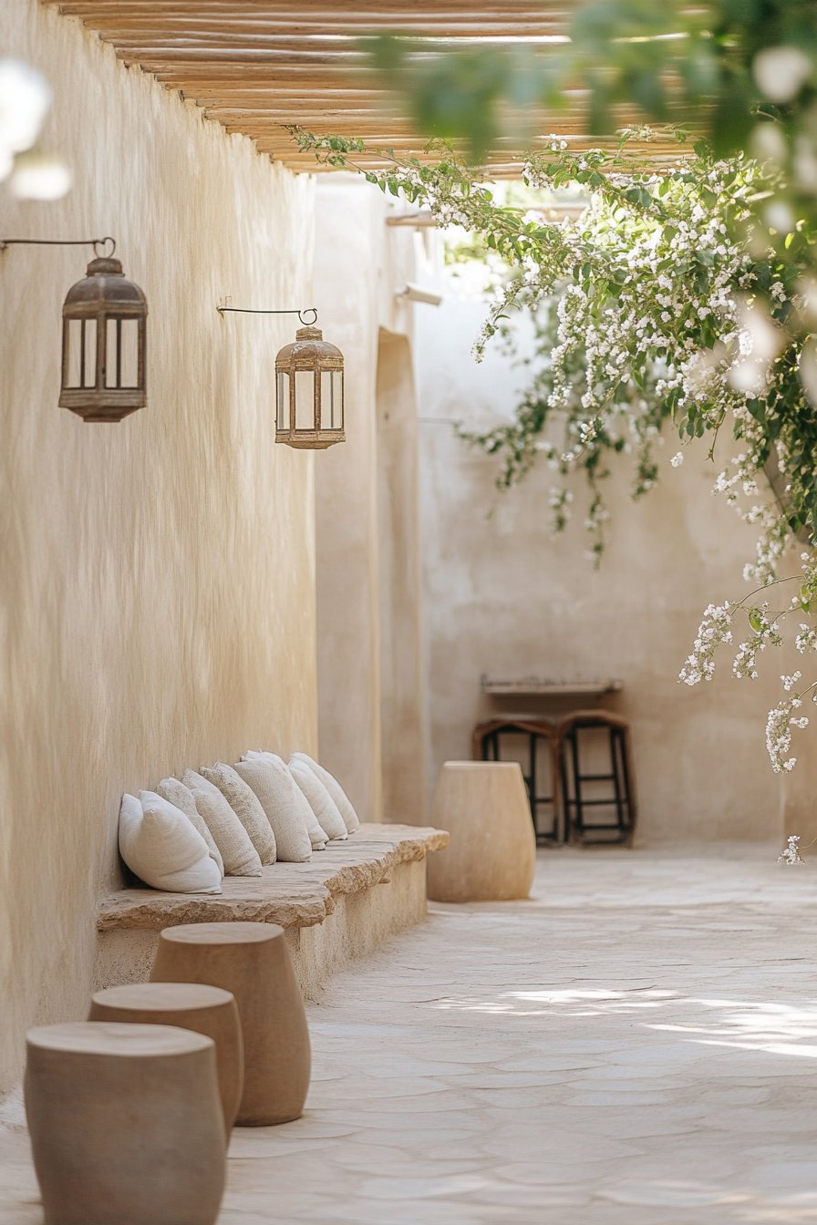 This serene courtyard features cascading bougainvillea vines, creating a vibrant contrast against the earthy tones of textured walls and natural stone seating. To replicate this look, incorporate low-maintenance plants and choose soft, neutral furnishings to enhance the minimalist aesthetic.