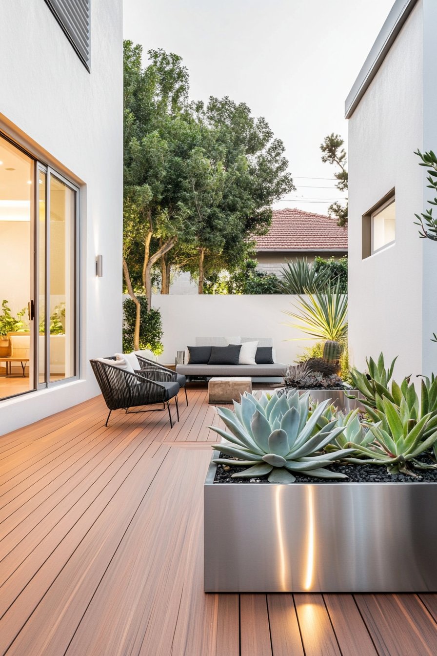 This modern courtyard showcases striking succulents like Echeveria and Agave, beautifully contrasted against sleek metallic planters and warm wooden decking. To replicate this look, consider using drought-tolerant plants and minimalist furnishings for a stylish, low-maintenance outdoor space.