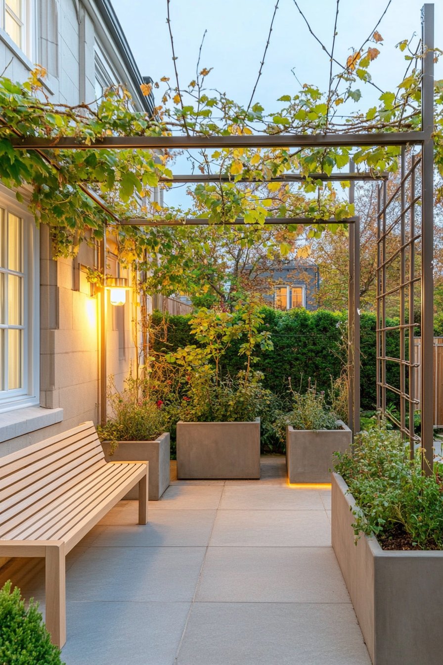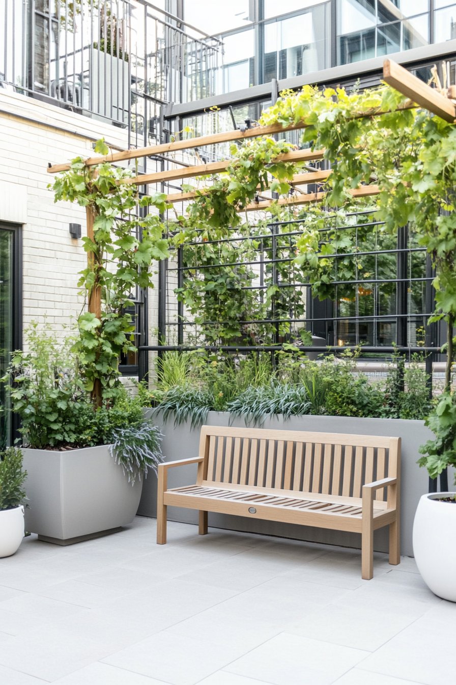 This contemporary courtyard features lush grapevines cascading over a sleek trellis, creating a vibrant green canopy that invites relaxation. To replicate this look, consider incorporating structured planters filled with aromatic herbs and ornamental grasses for added texture and fragrance.