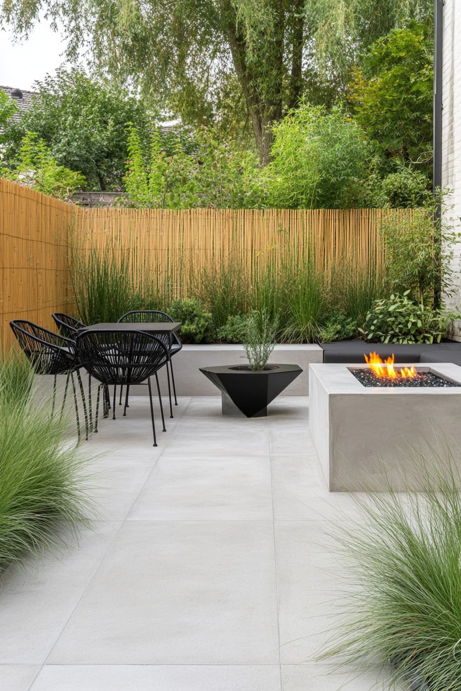The sleek concrete surfaces paired with vibrant ornamental grasses create a serene, modern aesthetic perfect for relaxation. Incorporate minimalist furniture and a firepit to enhance functionality while maintaining an uncluttered look.
