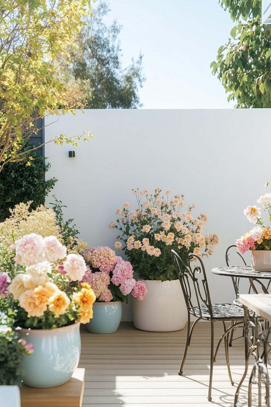 The vibrant mix of hydrangeas and cheerful dahlias creates a stunning focal point, while the pastel pots add a playful touch. To replicate this look, choose a variety of blooming plants and stylish containers that complement your outdoor space.