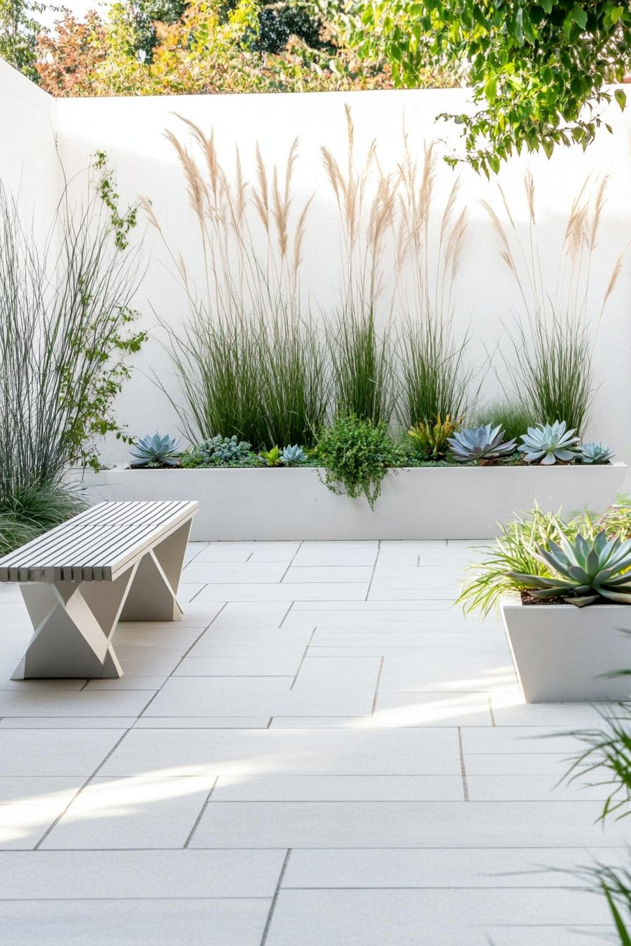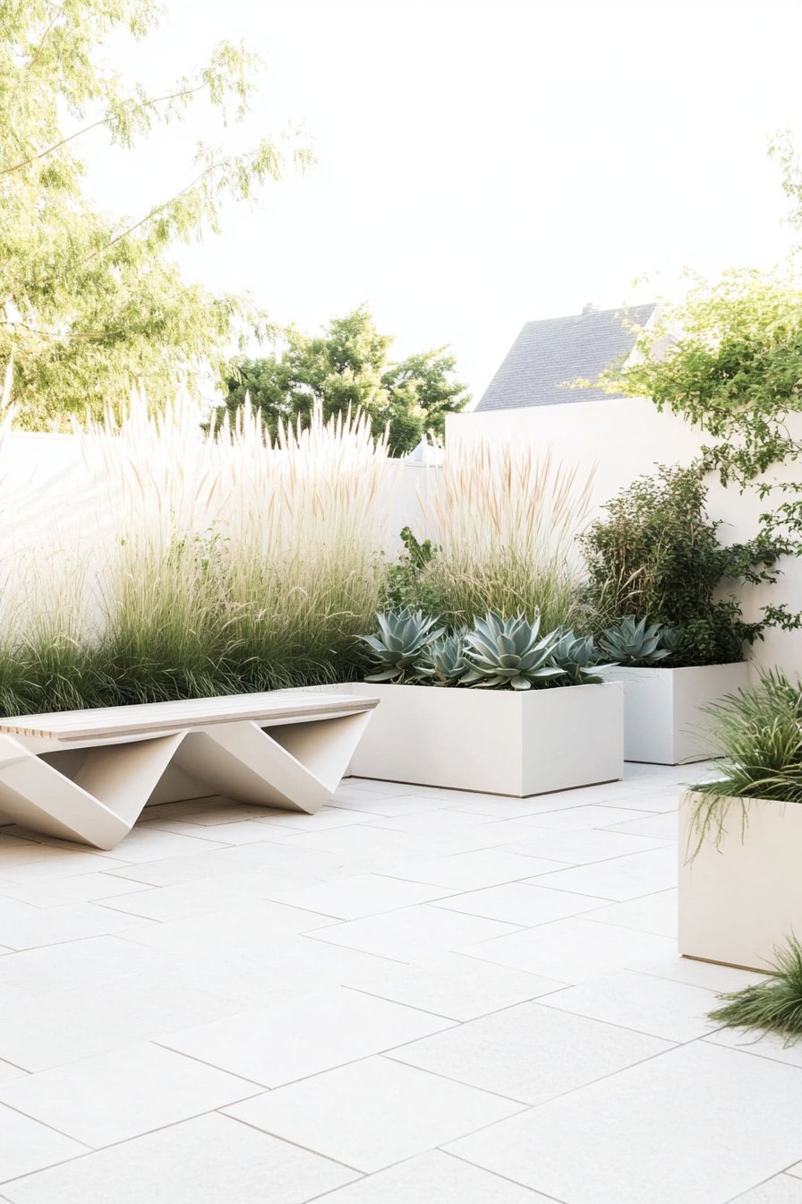 This design beautifully combines soft textures of ornamental grasses with striking succulent arrangements, creating a serene and modern atmosphere. To replicate this look, use low-maintenance plants like agave and pair them with sleek, minimalist planters for a clean aesthetic.