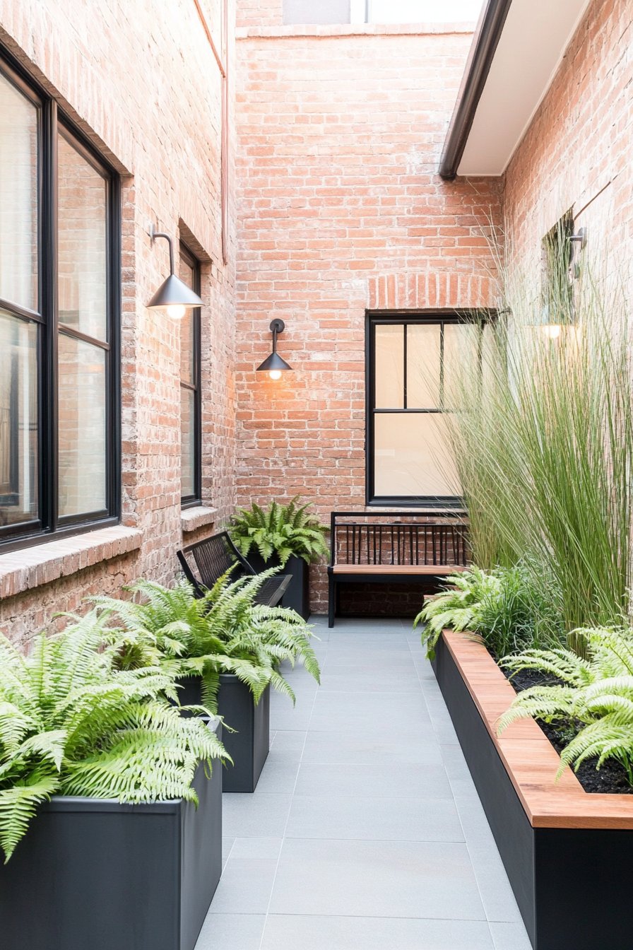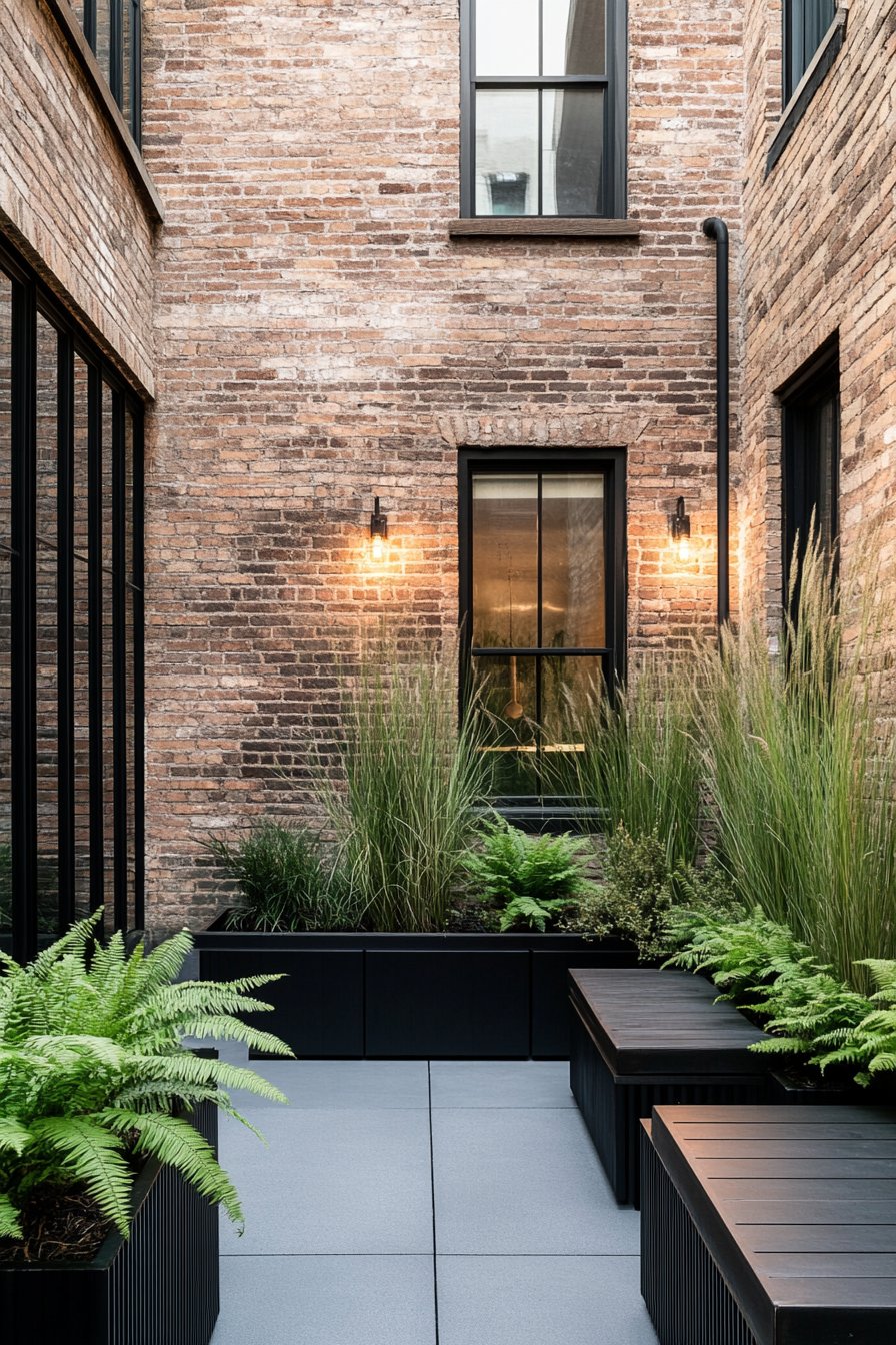 This design beautifully combines lush ferns with sleek black planters, creating a serene urban retreat that contrasts with the warm brick backdrop. To replicate this look, consider using hardy ferns and low-maintenance grasses in stylish containers, ensuring a cohesive color palette for a modern aesthetic.