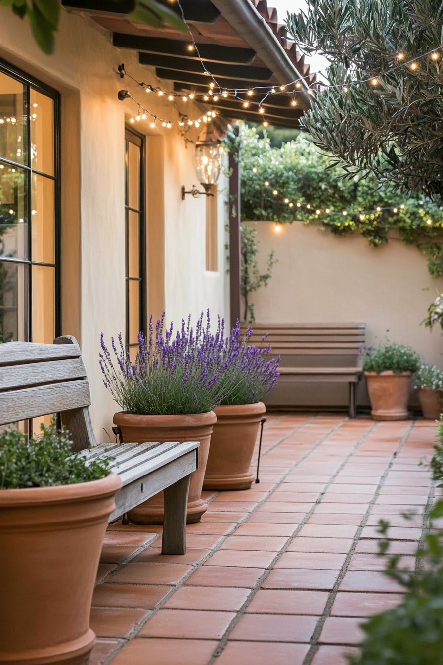 This charming courtyard features vibrant lavender planters that add fragrant color against warm terracotta tiles, creating a serene outdoor retreat. To replicate this look, consider using potted lavender and soft lighting to enhance the cozy atmosphere.