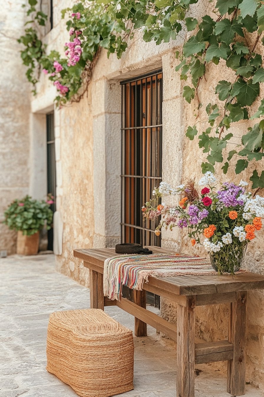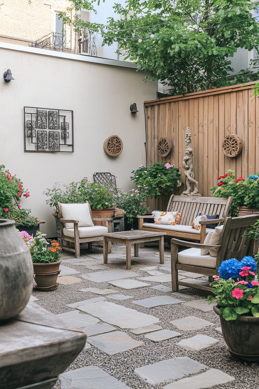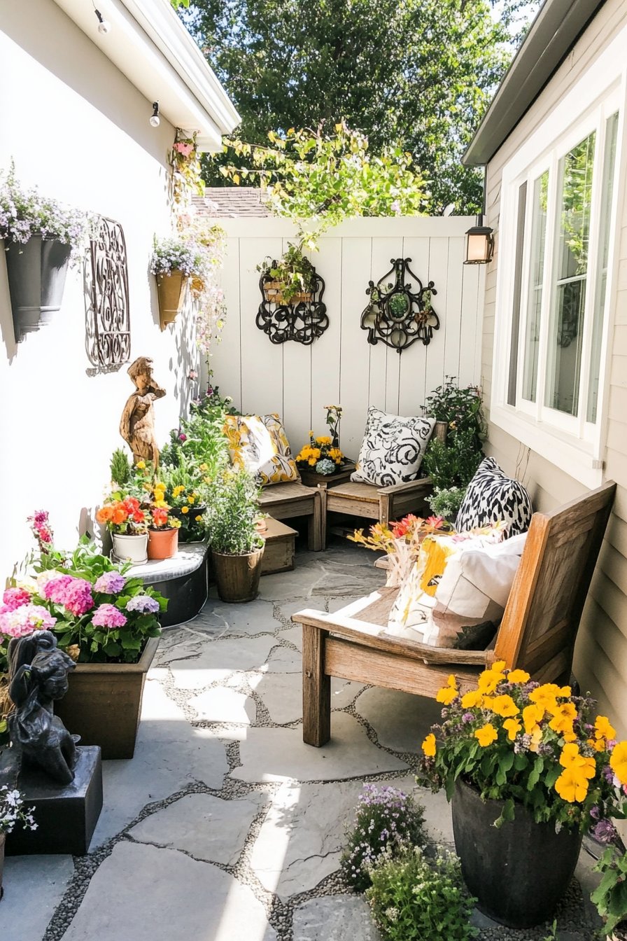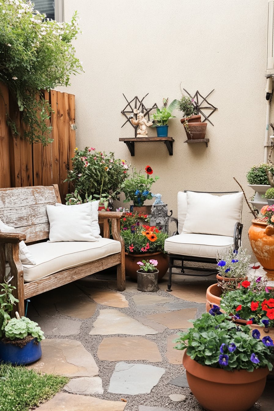 A charming courtyard blends rustic wooden seating with vibrant potted flowers like pansies and geraniums, creating a cozy retreat. To replicate this look, use a mix of colorful containers and incorporate comfortable seating to enhance relaxation.