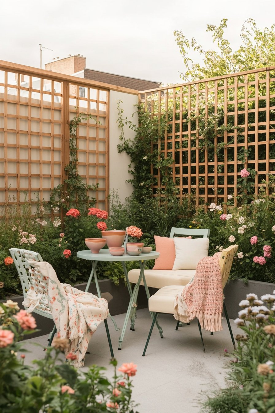 This cozy courtyard features vibrant geraniums and soft pastel accents, creating a welcoming atmosphere perfect for relaxation. To replicate this look, use colorful planters and comfortable seating, adding textile layers for warmth and texture.