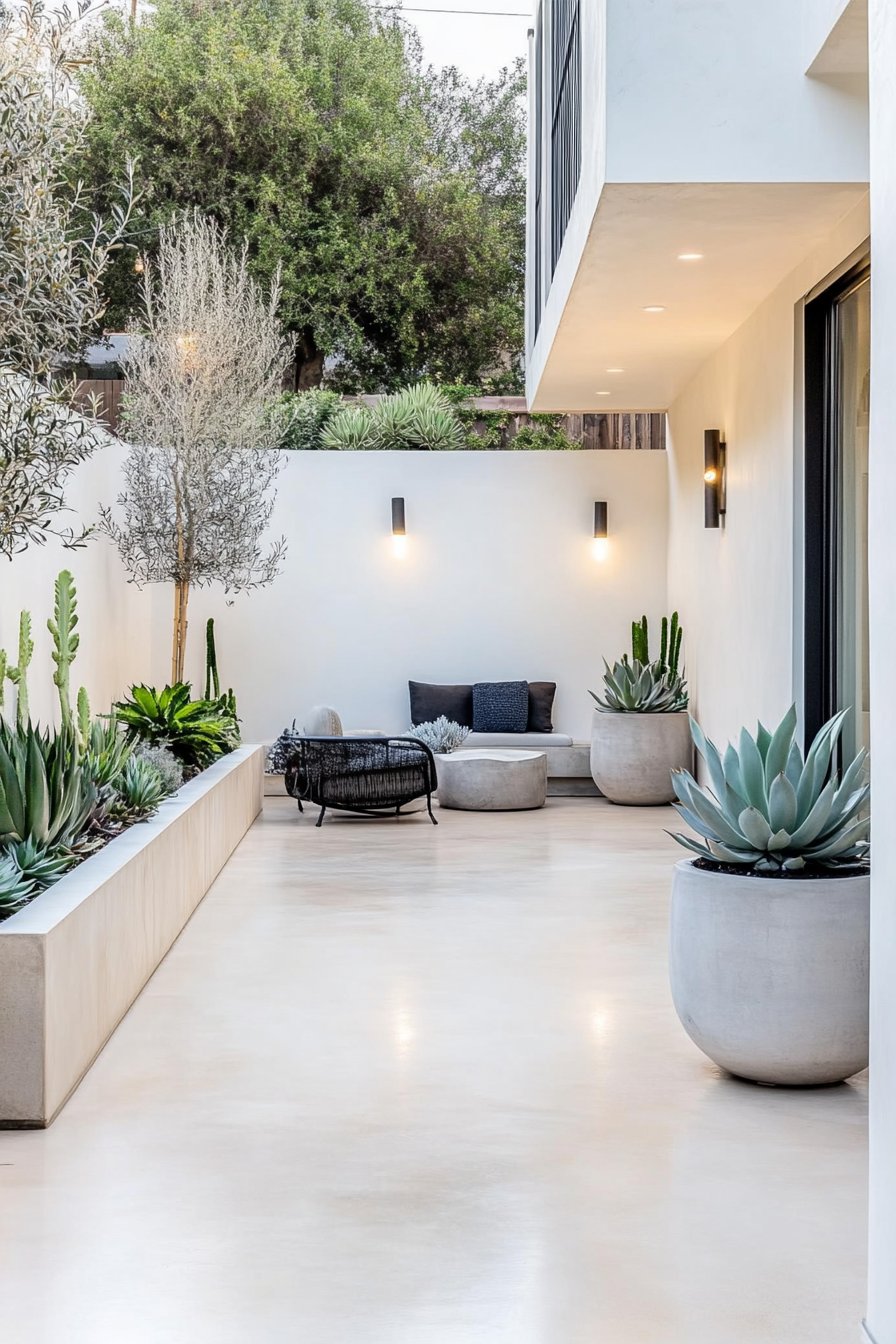 The clean lines and neutral palette create a serene atmosphere, enhanced by striking succulents like agave and cacti in stylish concrete planters. To achieve a similar look, opt for minimalistic furniture and focus on low-maintenance plants that thrive in your climate.
