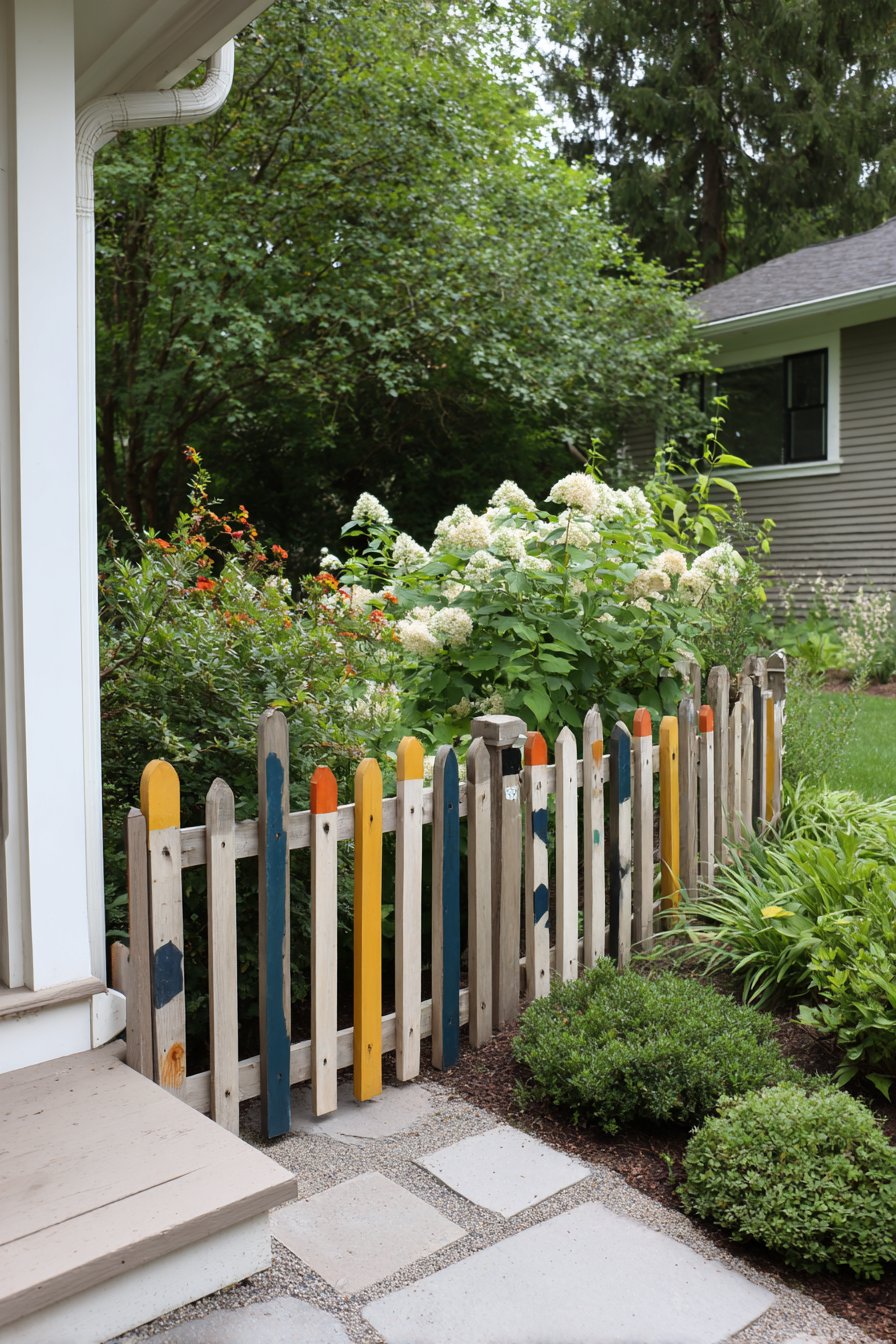 The vibrant, multi-colored wooden picket fence adds a whimsical touch, harmonizing beautifully with the lush greenery and cheerful blooms surrounding it. Incorporate climbing plants and cheerful flowers at the base to enhance the inviting atmosphere of your garden space.