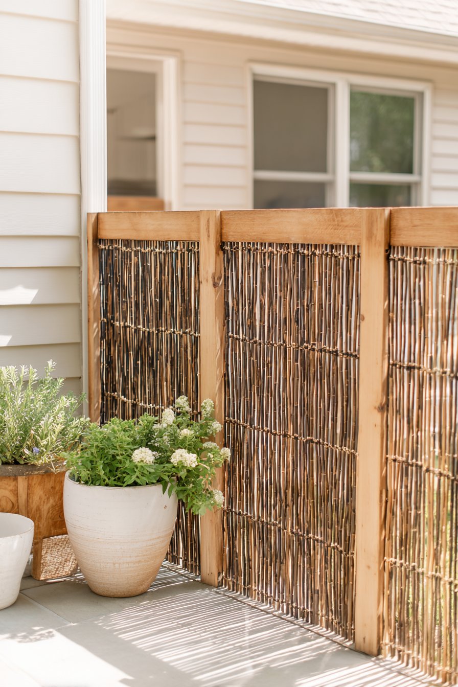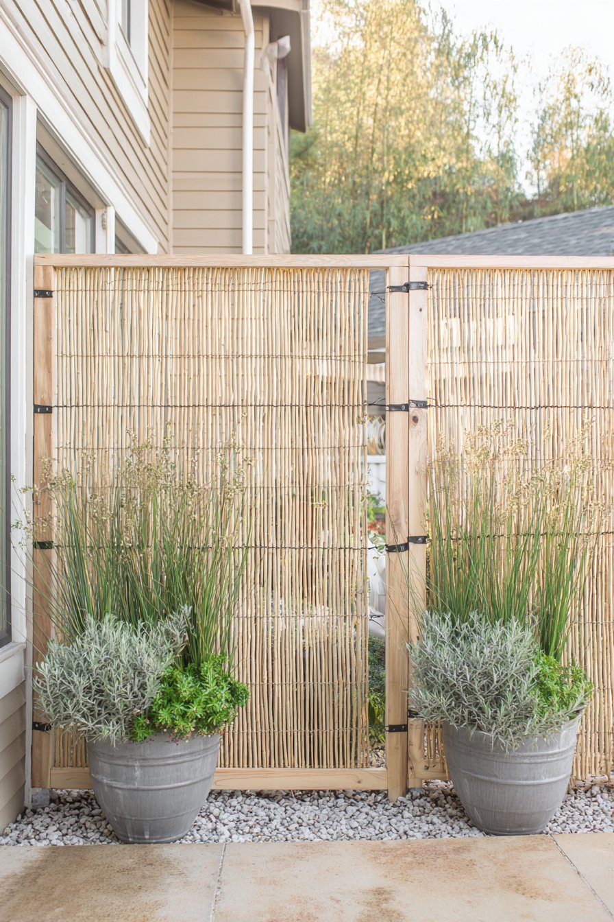 The warm, natural tones of the bamboo-style privacy fence create a serene atmosphere, beautifully complemented by lush, textured plantings in understated gray pots. Incorporating tall grasses and fragrant herbs adds both height and sensory interest, making it an inviting retreat.
