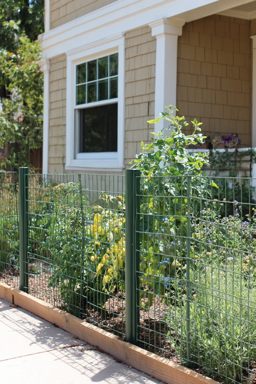 The vibrant green wire fence beautifully contrasts with the warm wooden base, creating a charming boundary for a flourishing vegetable and flower garden. Incorporate a mix of colorful blooms and edible plants for texture and visual interest, enhancing your outdoor space’s appeal.