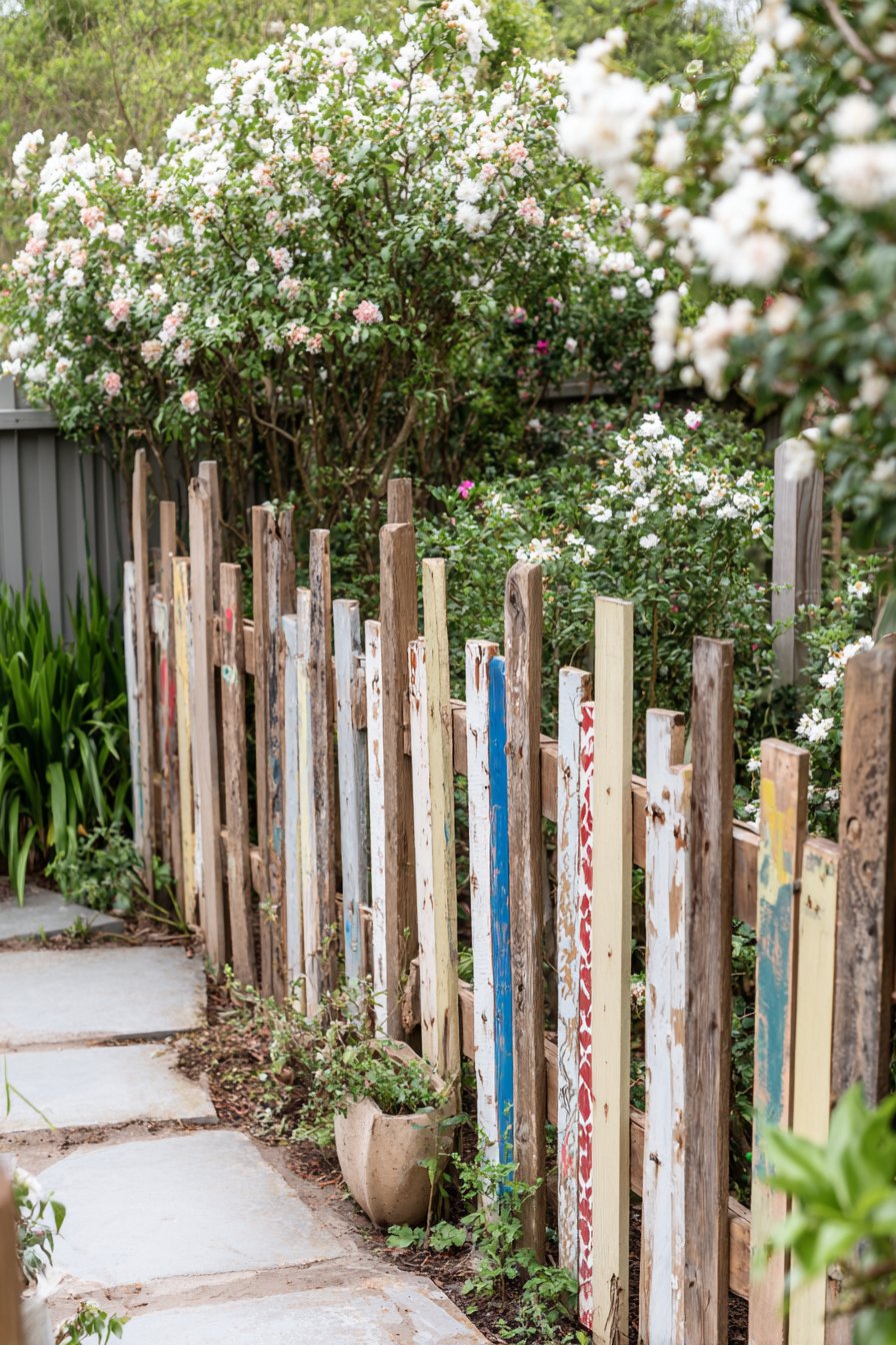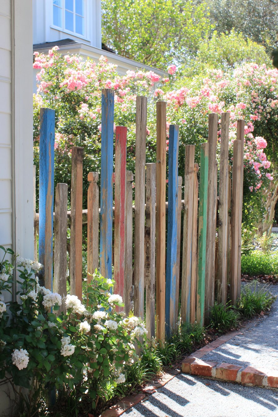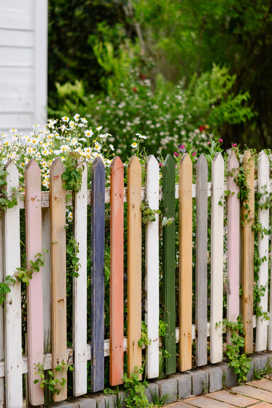 To recreate this fence on a budget, source reclaimed wood or pallets, and apply a few coats of colorful outdoor paint for a playful finish. Simple tools like a hammer, nails, and a saw are all you need to assemble your unique garden border.