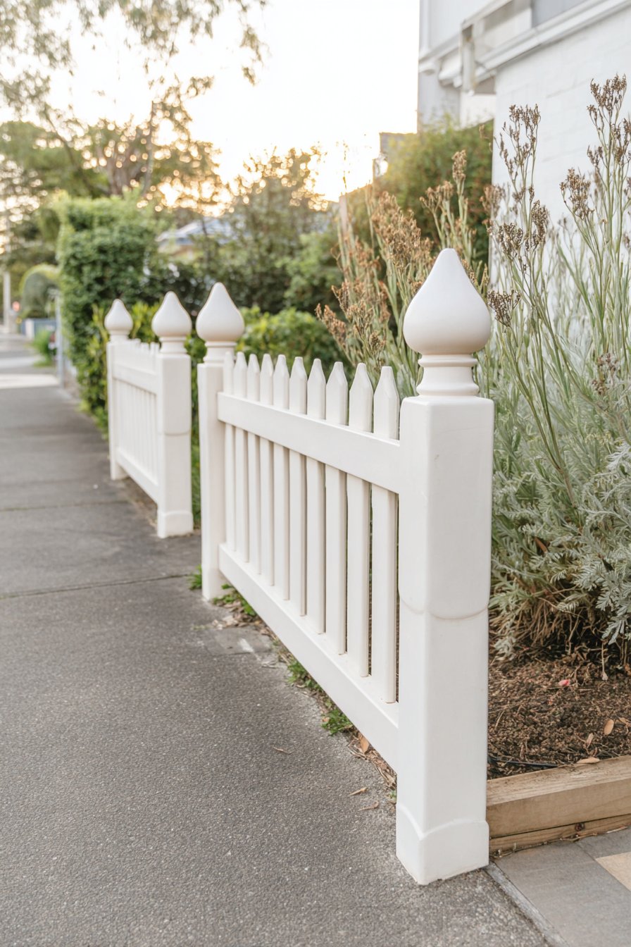 The charming white picket fence, accented with finials, beautifully contrasts the lush greenery, creating a welcoming and classic garden aesthetic. To achieve this look, consider pairing simple white fencing with a mix of low-maintenance plants and seasonal blooms for added color and texture.
