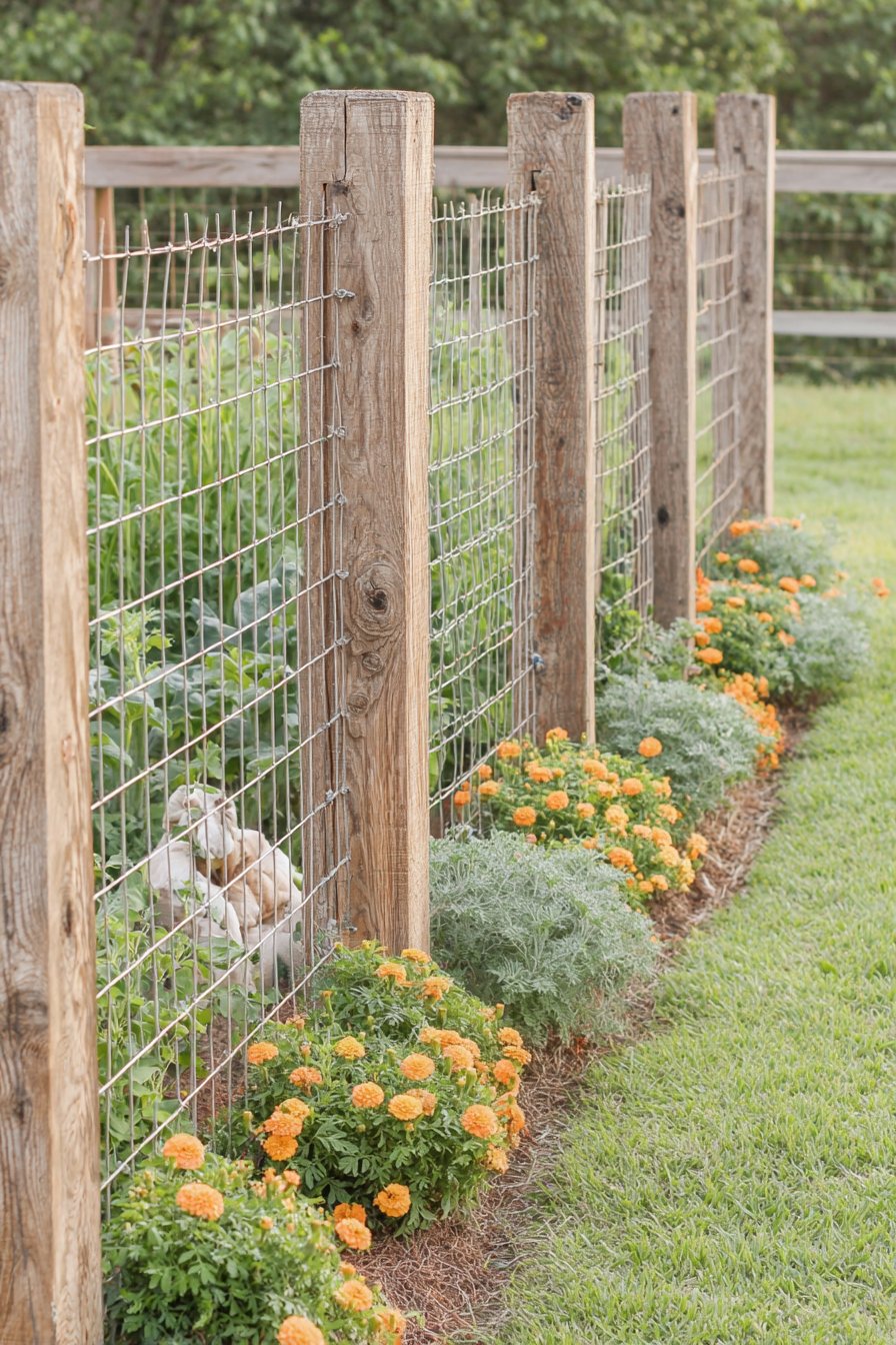 The rustic wooden posts paired with wire fencing create a charming and practical boundary, beautifully complemented by vibrant marigolds and soft green foliage. This design invites a warm, welcoming atmosphere, encouraging a mix of colorful blooms and lush greenery for a lively garden feel.