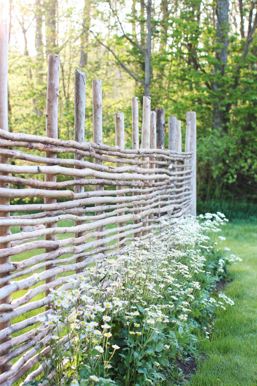 To recreate this fence on a budget, gather fallen branches or saplings and use them to weave between sturdy posts. You’ll need a set of wooden stakes and twine or wire for securing the branches in place.