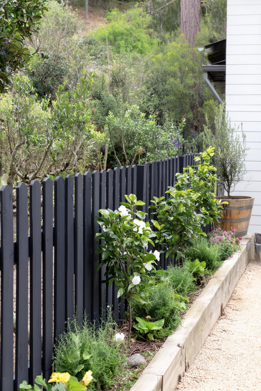 The striking black picket fence beautifully contrasts with the lush greenery, creating a vibrant yet serene garden space filled with varied textures and colors. To achieve this look, combine evergreen shrubs with seasonal flowers and consider layering plants for depth and visual interest.