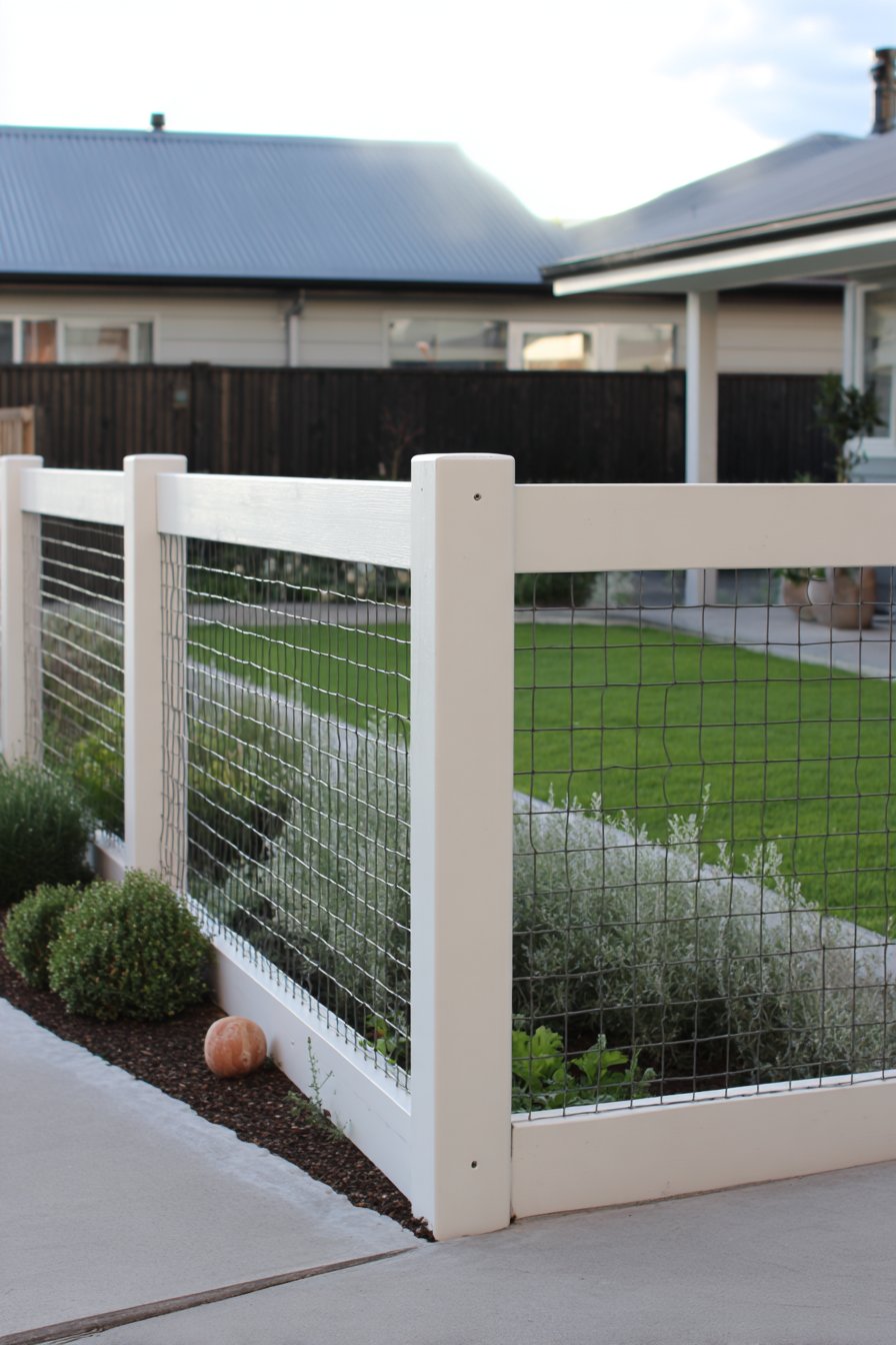 The clean white wooden posts paired with wire fencing create a modern yet rustic charm, allowing plants to thrive in the surrounding garden beds. Soft greens and textured herbs complement the minimalist design, making it a serene retreat that invites relaxation.