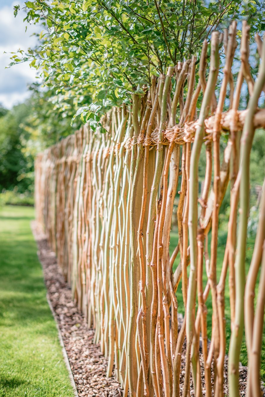 The warm, natural hues of the woven willow fence beautifully complement the lush greenery, creating a serene and inviting garden space. Incorporate native plants and rustic accessories to enhance the organic feel and provide a habitat for local wildlife.