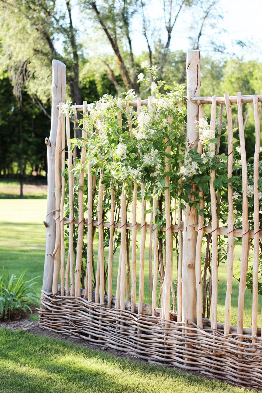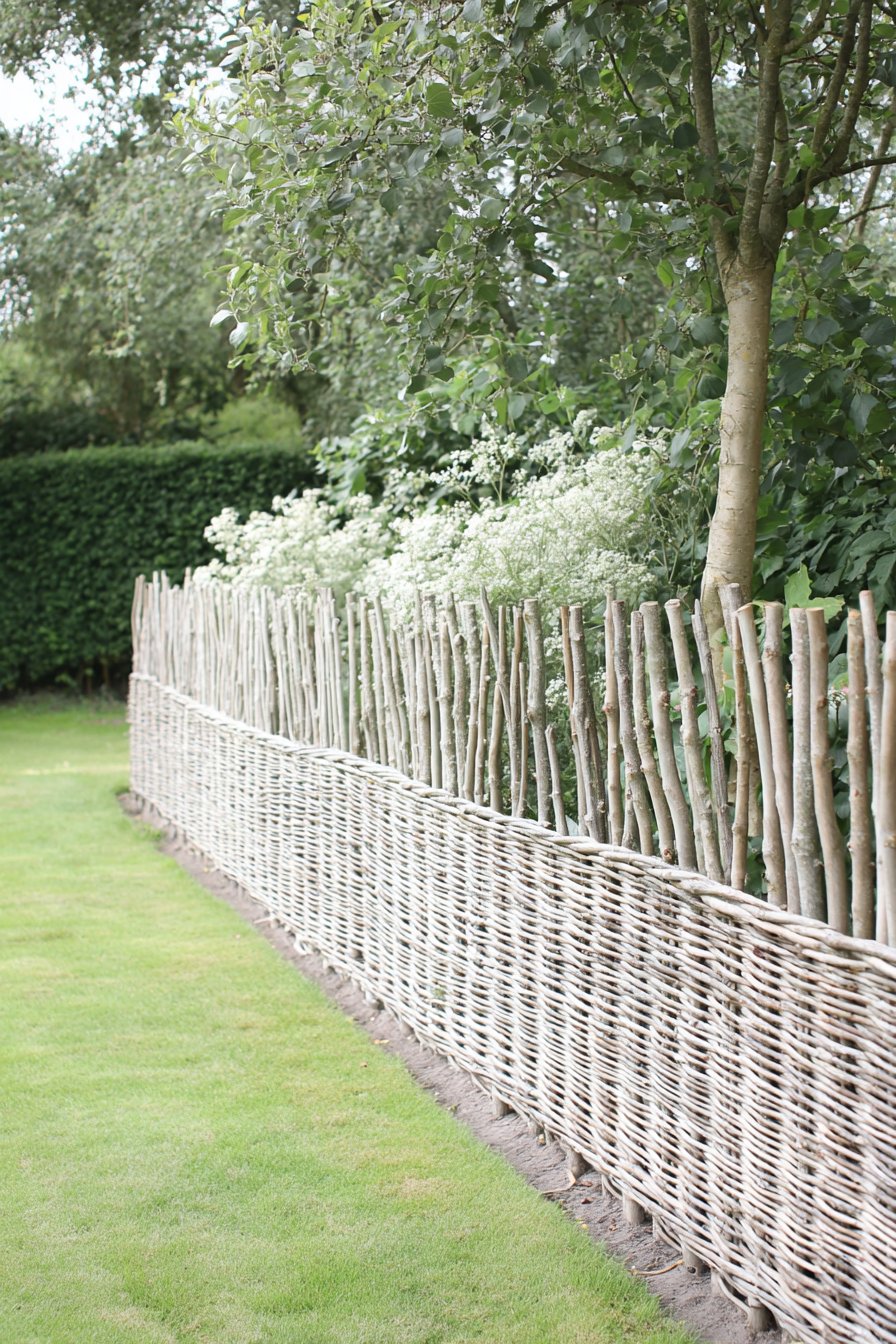 The charming woven willow fence, with its natural tones and textured layers, beautifully complements lush greenery and delicate white blooms, creating a serene garden retreat. To evoke this rustic style, incorporate organic materials and native plants that harmonize with the surrounding landscape for a cohesive look.