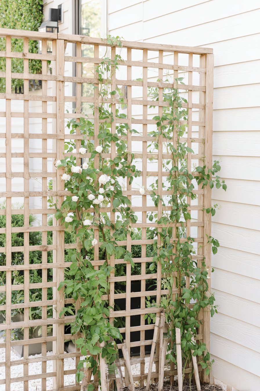 The warm wooden lattice trellis beautifully complements the lush green climbing plants and delicate white flowers, creating a serene and inviting garden corner. To achieve this aesthetic, incorporate a mix of foliage and blooms that thrive in your climate, ensuring vibrant textures and colors throughout the seasons.